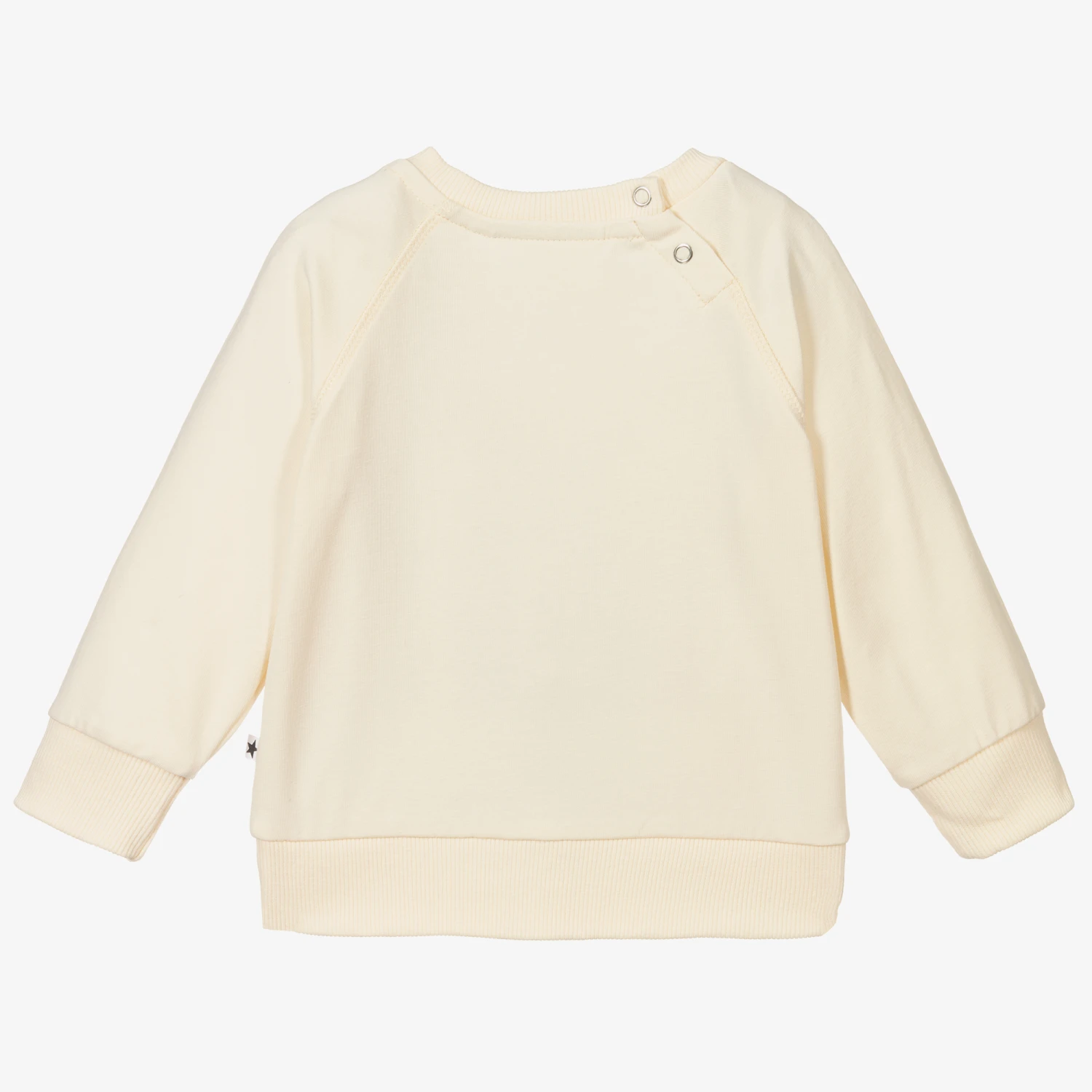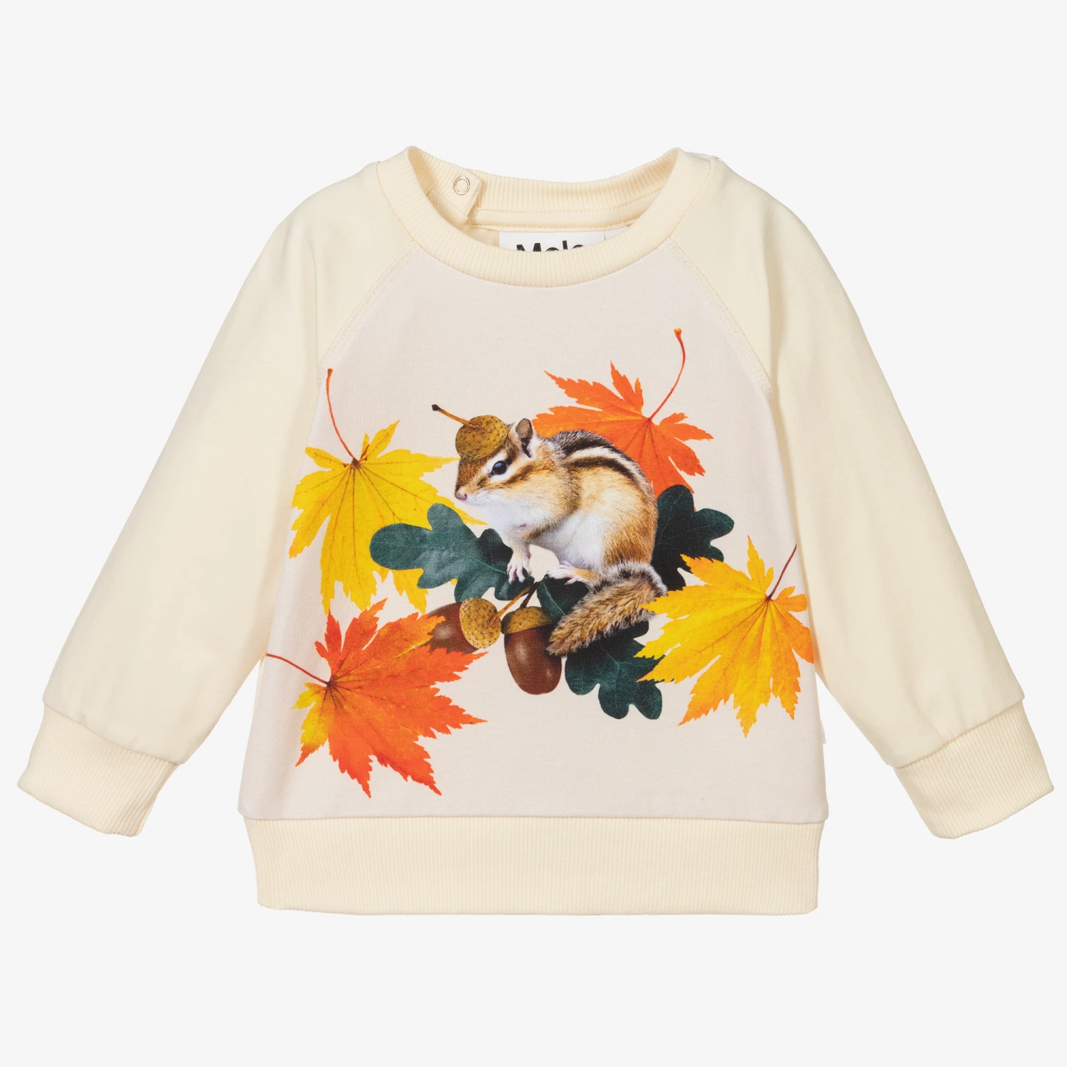 Ivory organic cotton, lightweight sweatshirt for little girls by Molo, with a cute autumnal chipmunk print on the front and a popper fastening on the back.