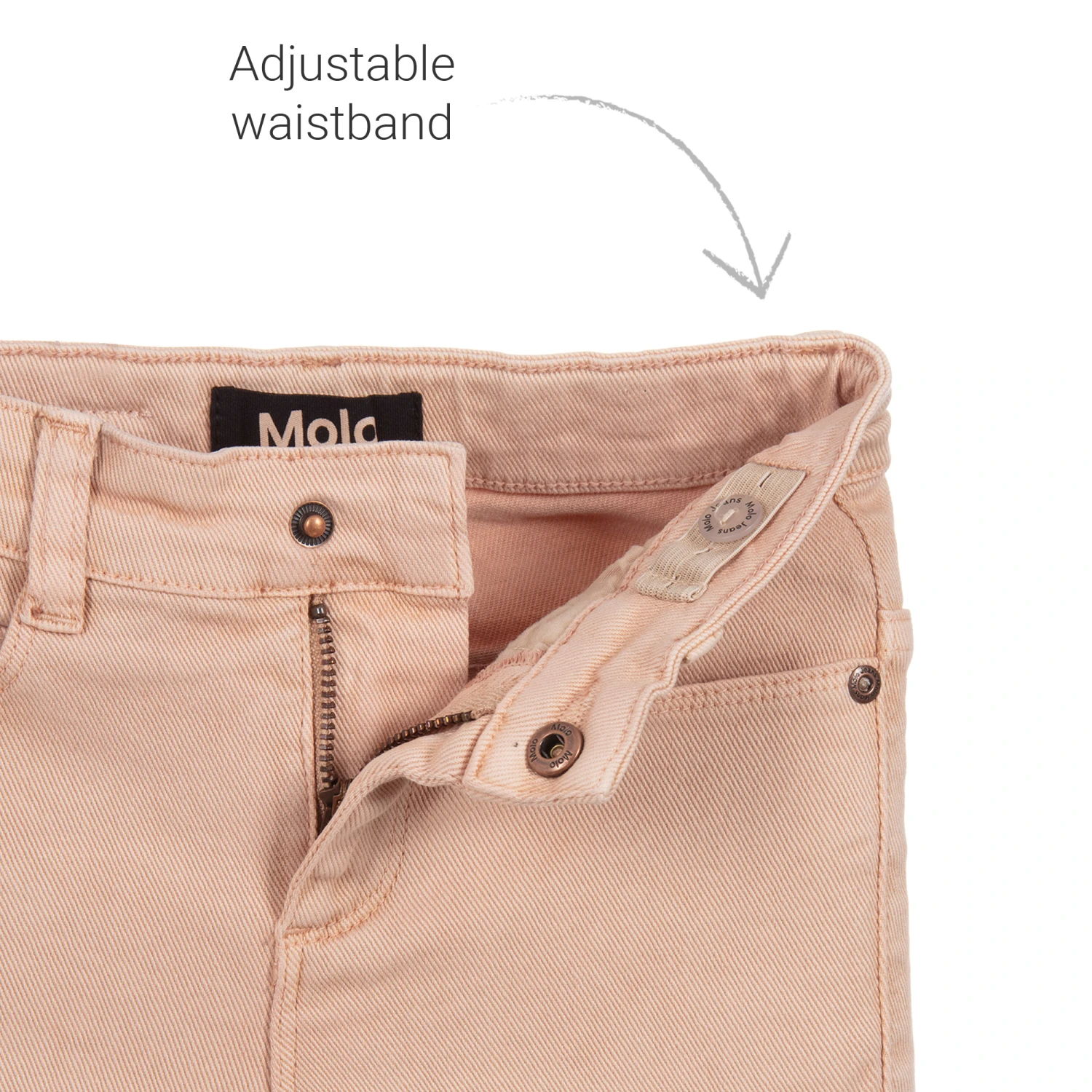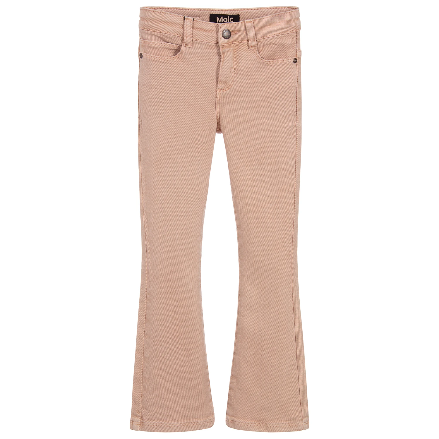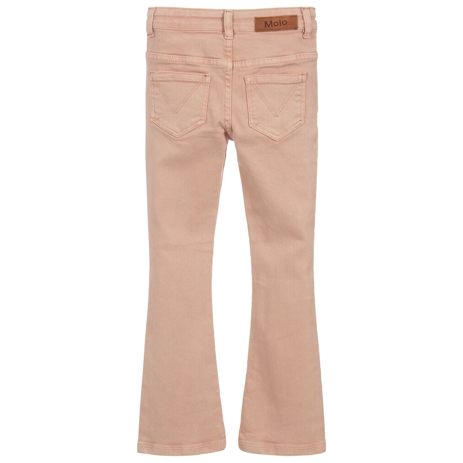 Girls pink flared slim-fit jeans from Molo, made in soft mid-weight cotton denim. They have an adjustable waistband and five pockets.