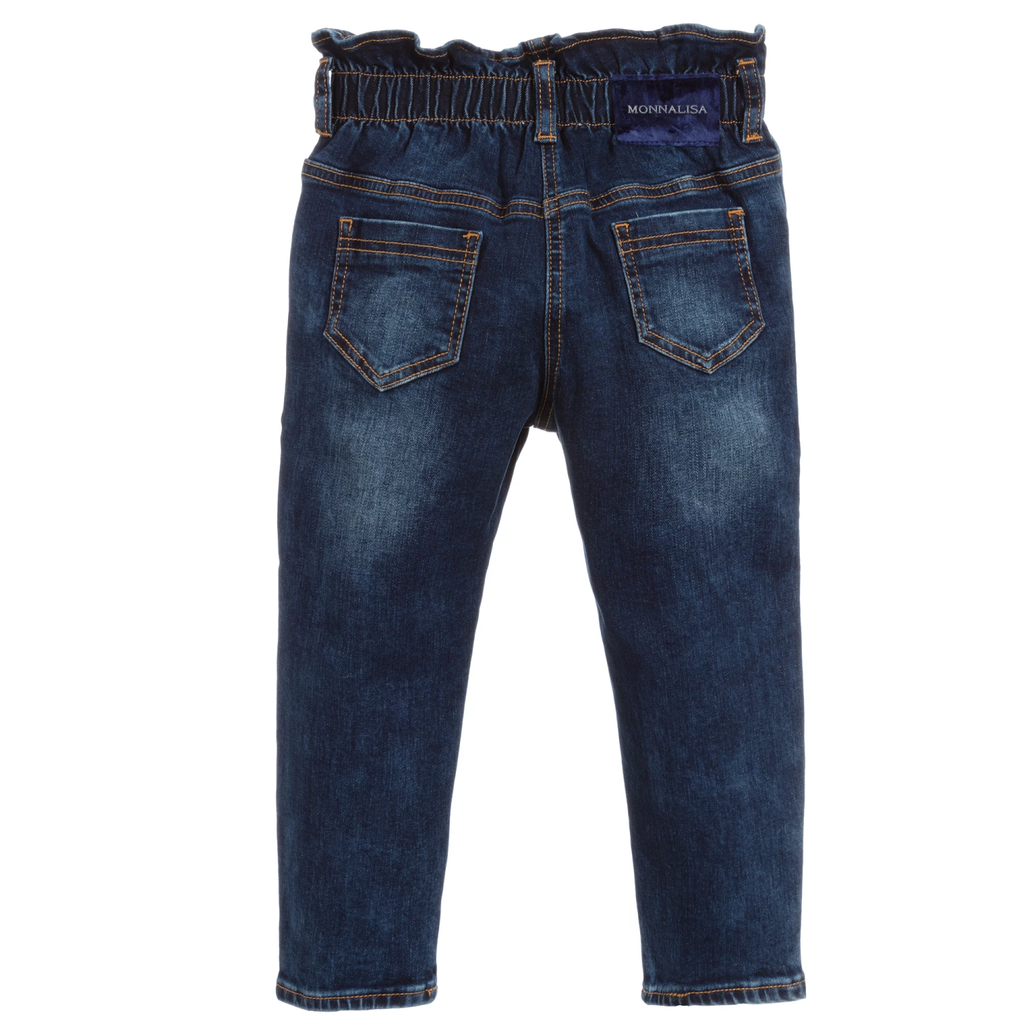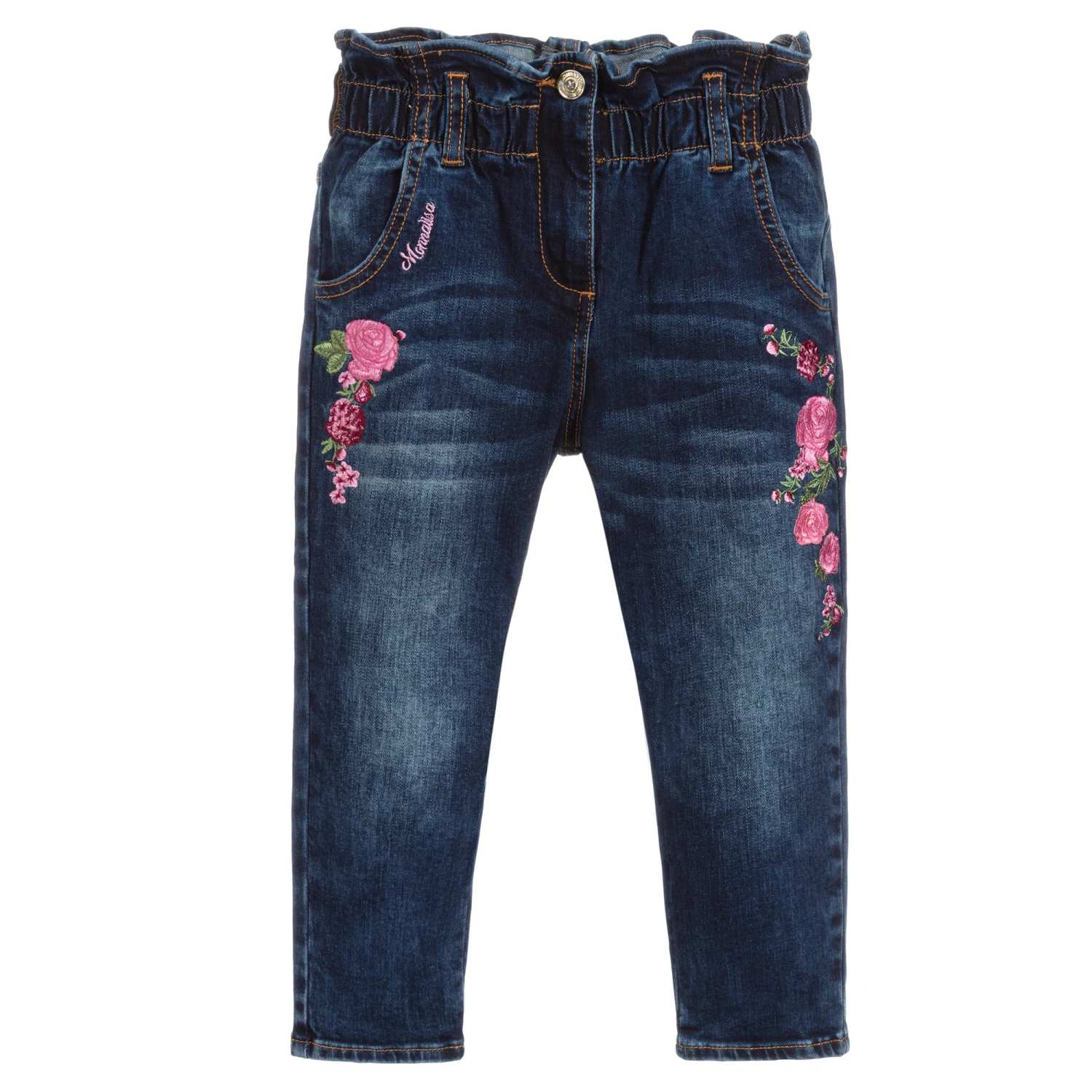 Girls dark blue washed jeans with pink roses embroidery by Monnalisa. Made in super stretchy cotton denim, they have a ruffled and elasticated high waist. There are pockets on the front and back with a blue velvet logo patch on the back.