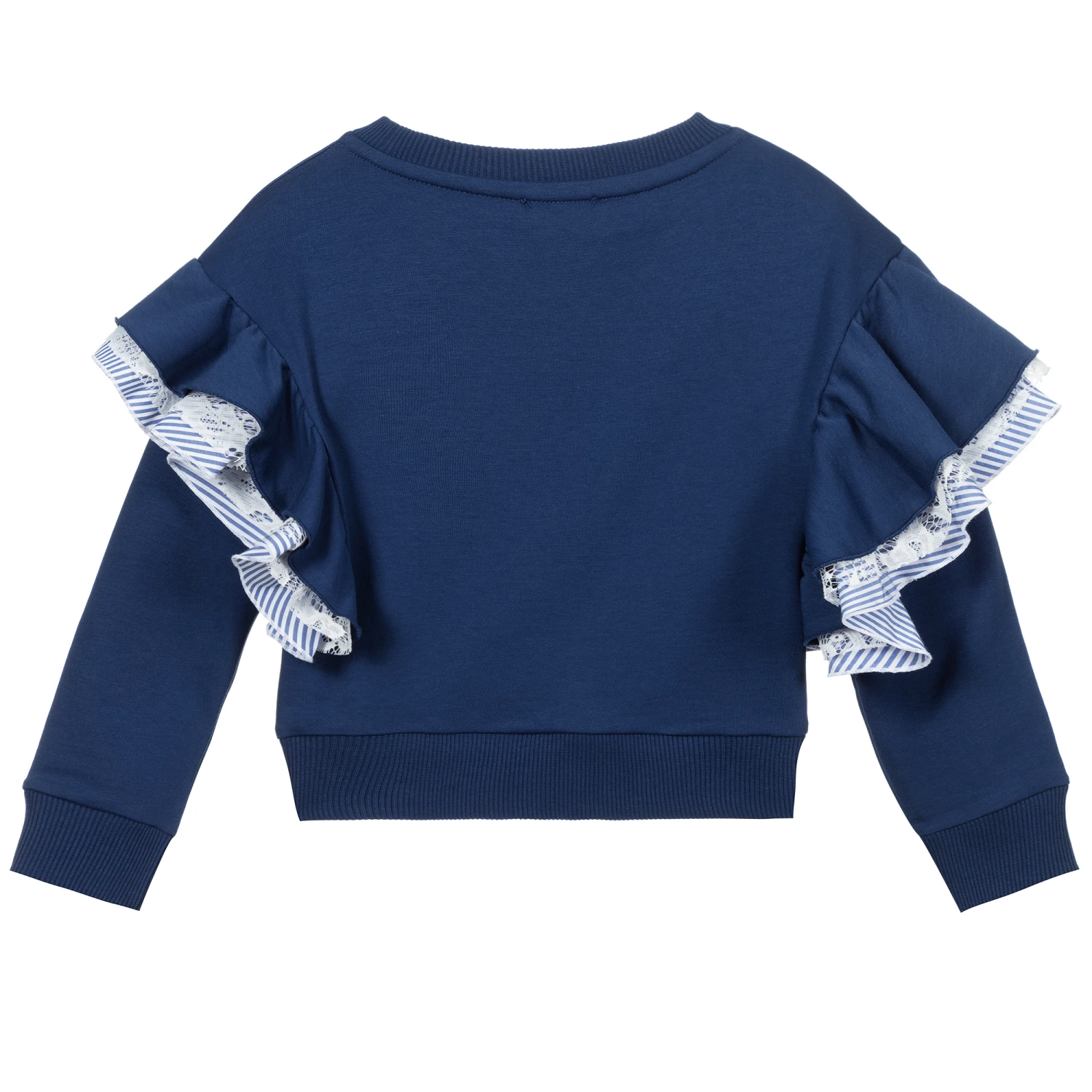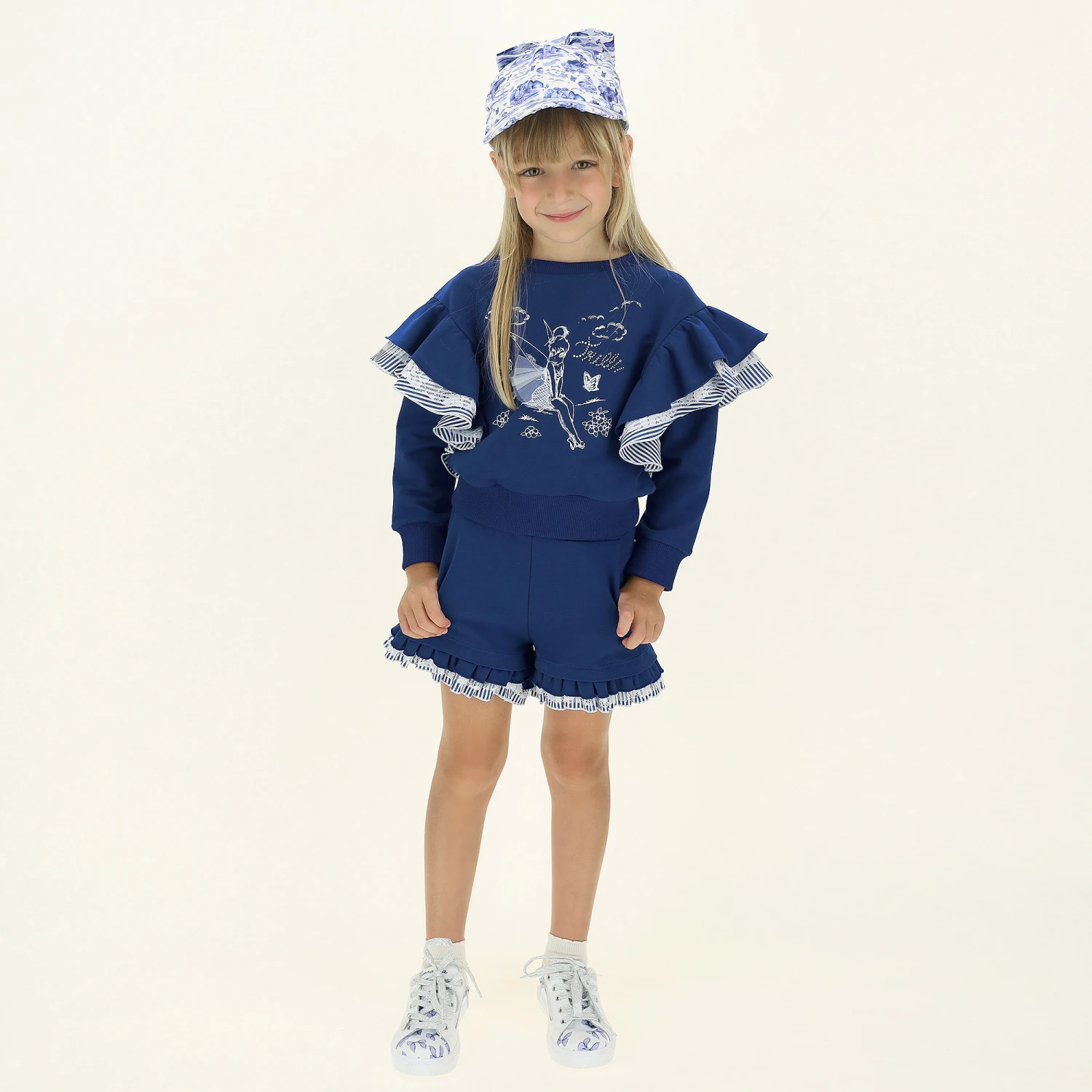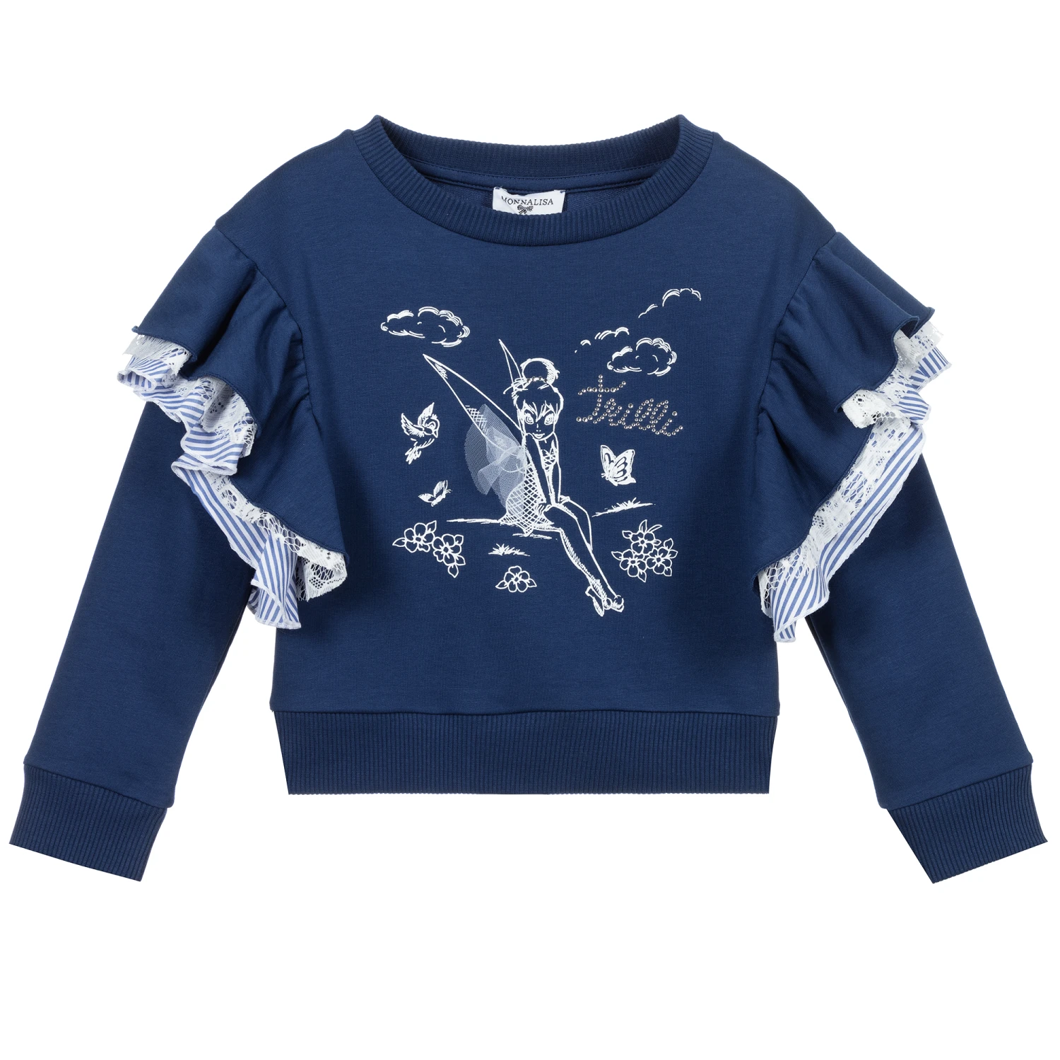 Navy blue sweatshirt for girls by Monnalisa, made in soft cotton jersey. It has layers of ruffles over the shoulders, with navy blue and white striped cotton and white lace trims. It has a white Tinkerbell print on the front, with soft tulle 3D wings and ‘Trilli’ (the Italian for Tinkerbell) spelled out in diamantés.