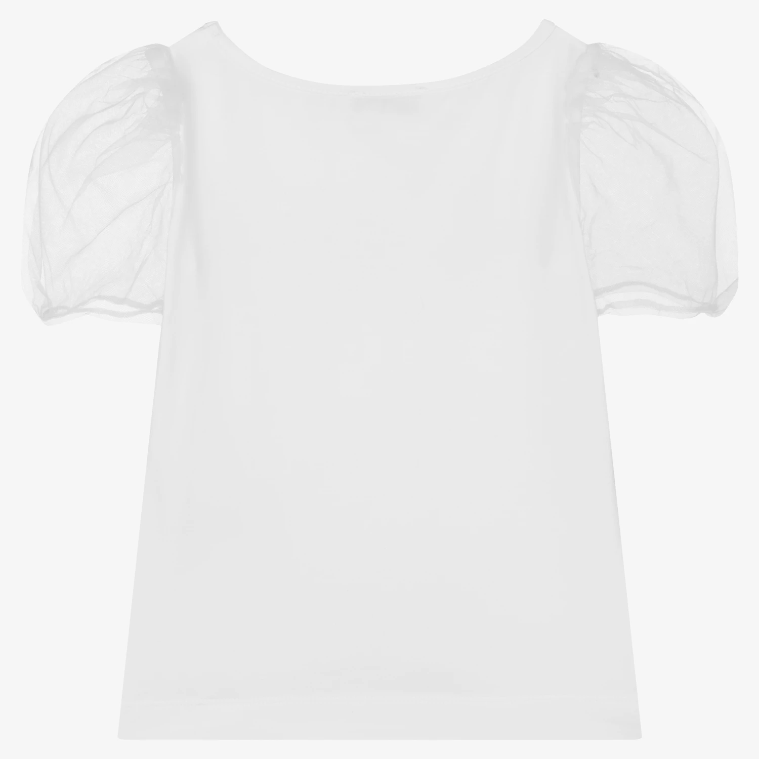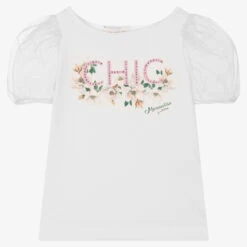 Eye-catching ivory cotton T-shirt by Italian brand Monnalisa. On the front is the word ‘Chic’, sparkling in pink diamantés, surrounded by a painted-effect floral print and the designer’s logo below. Made in stretchy jersey for comfort and fit, this pretty design has puffed sleeves in sheer tulle for a feminine touch.