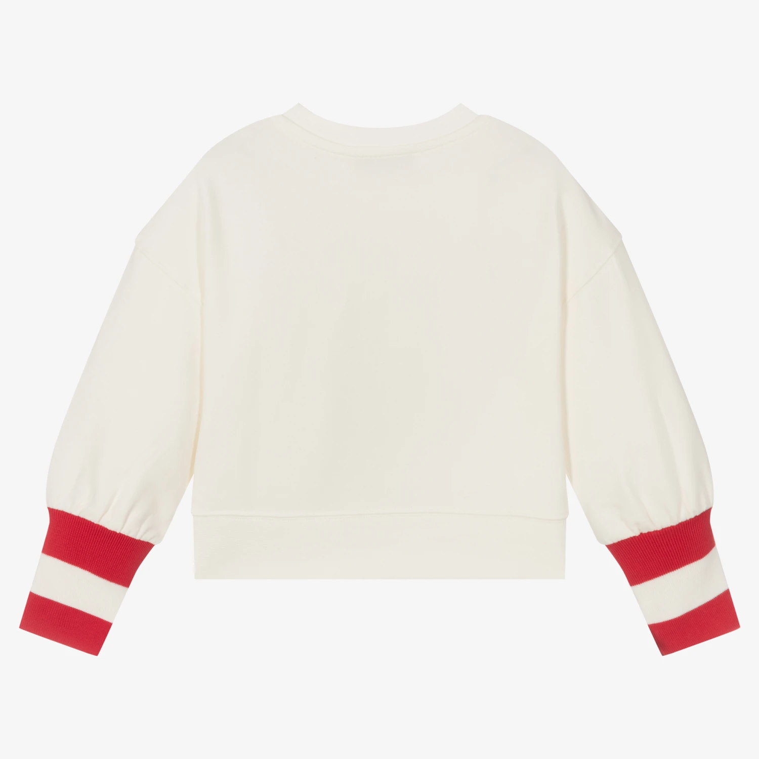Eye-catching ivory sweatshirt for girls by Italian designer Monnalisa. It has a beige teddy bear wearing a red bow on the front, sparkling with rhinestones and with the brand’s black logo below. It is made in comfortable cotton jersey with a warm, fleecy inside and deep, ribbed cuffs for extra cosiness, striped in red.
