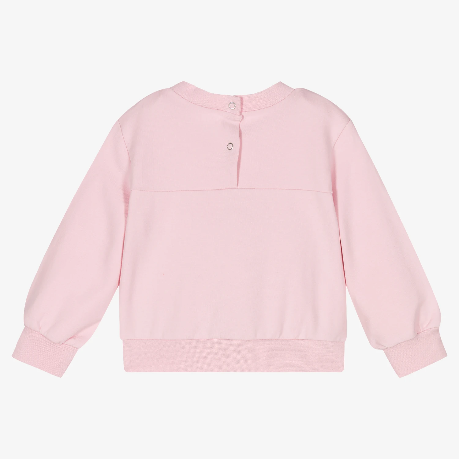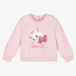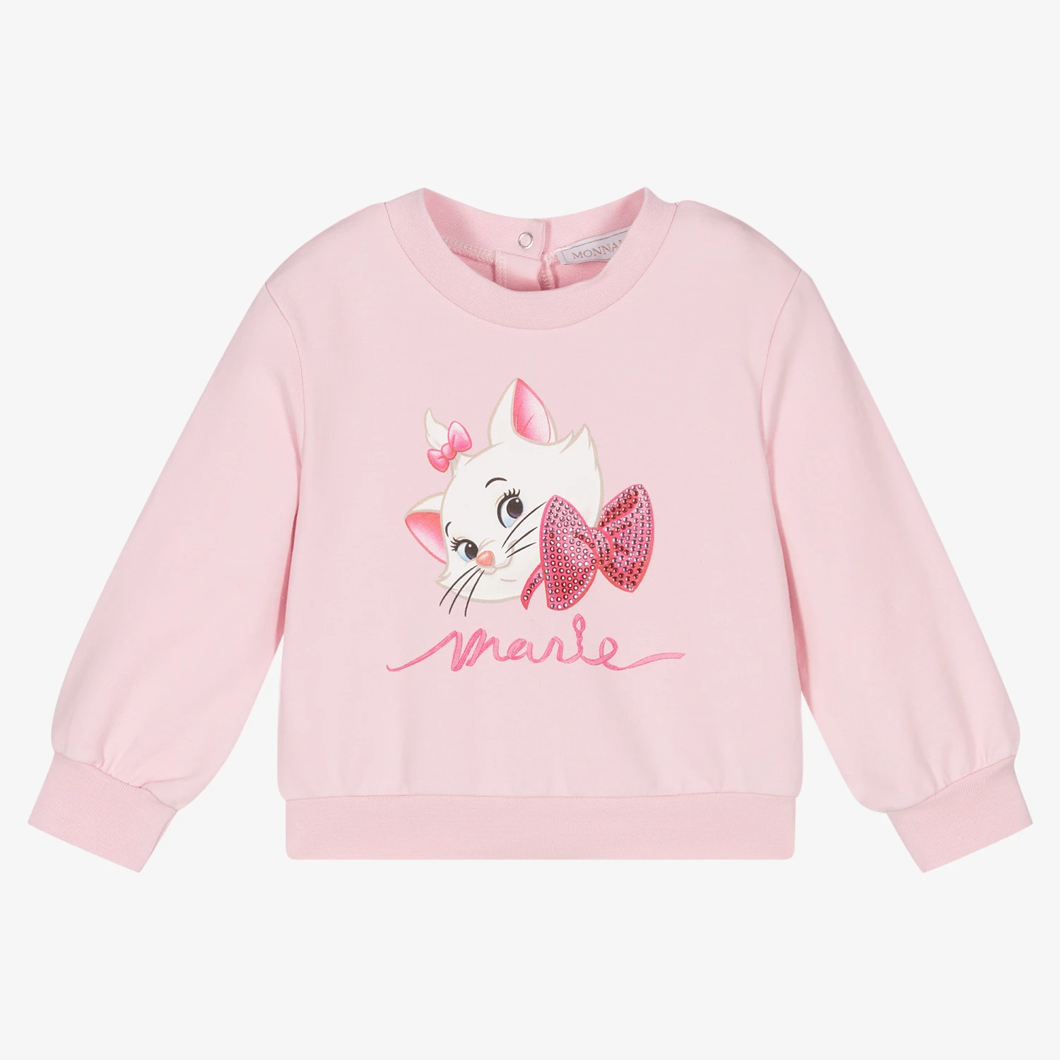 Cute pink sweatshirt for little girls by Monnalisa, made in soft cotton jersey. It has Disney’s Marie Aristocat printed on the front in white and pink, with a sparkly diamanté bow. There are useful popper fastenings on the back.