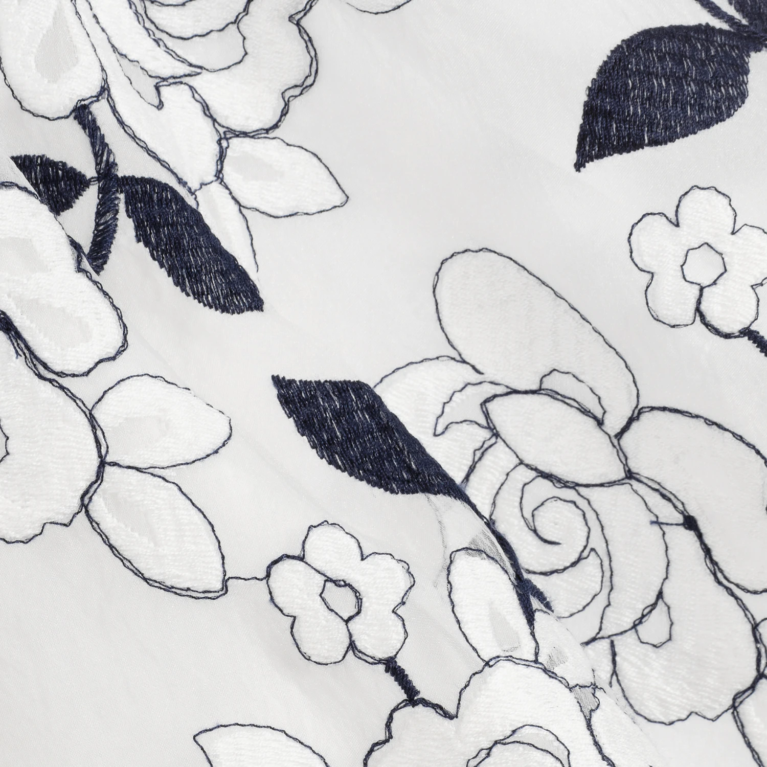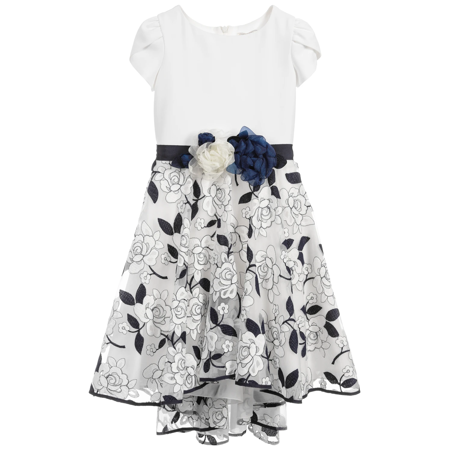An elegant ivory dress for girls by Monnalisa Chic. The soft crêpe bodice has pretty tulip sleeves and zip fastening on the back. The flared skirt is made in a sheer silk-blend voile, beautifully embroidered with navy blue and ivory flowers, and has a raised hem at the front. There is a removable grosgrain sash belt in navy blue with beautiful ivory and navy blue tulle flowers.