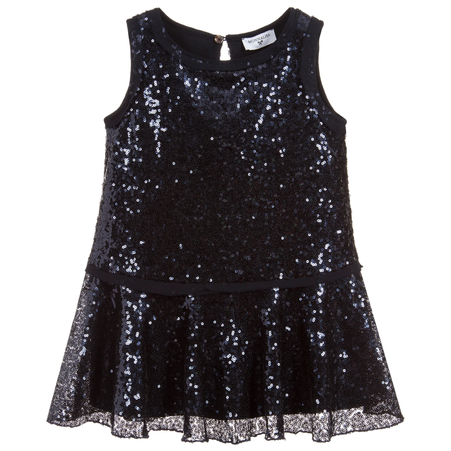 Girls navy blue sequin dress from Monnalisa. With an A-line flared shape, this sparkly shift dress fastens on the back with a single button.