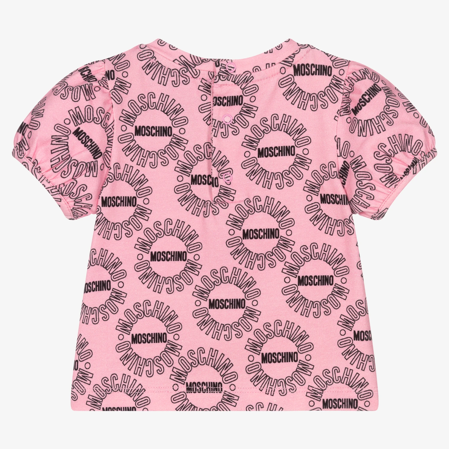 Pink cotton T-shirt for little girls by Moschino Baby. Soft and stretchy, there are sweet puffed sleeves, an all-over circle logo print in black and the signature Moschino Teddy Bear logo print on the front. This comfortable top has popper fastenings on the back for ease when dressing.