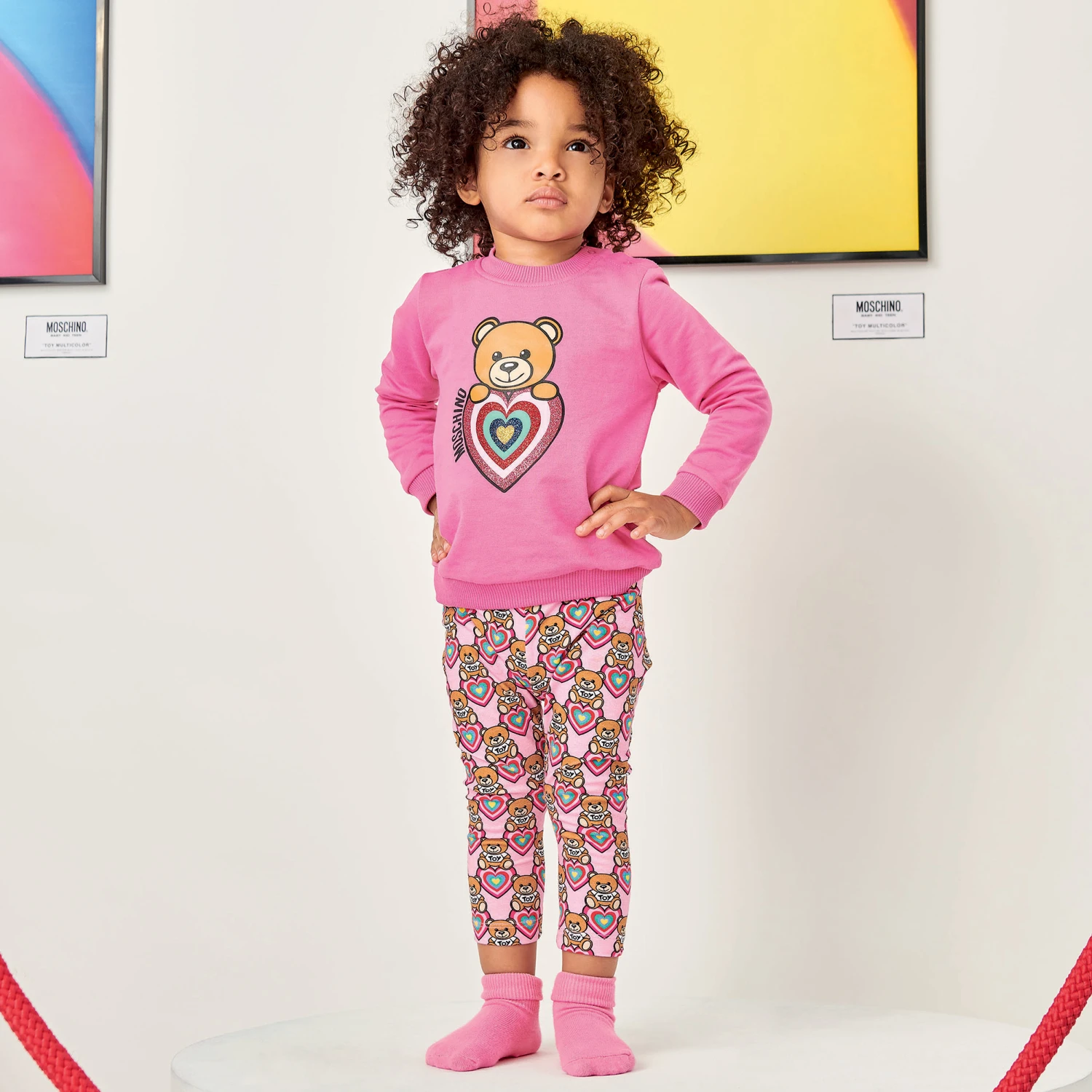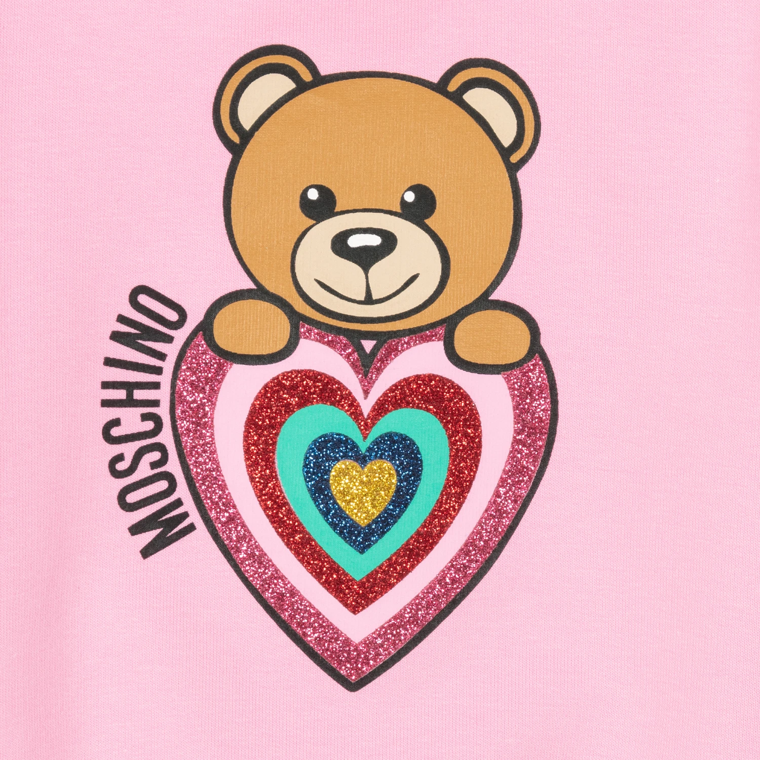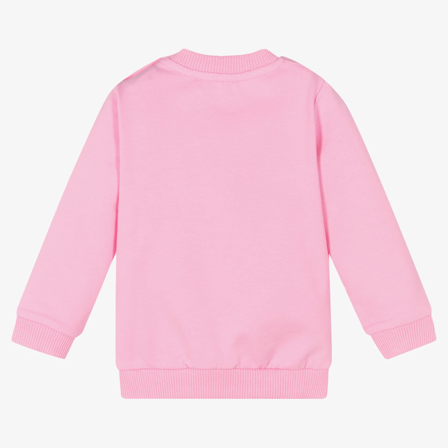 Little girls pink cotton sweatshirt from Italian brand Moschino Kid-Teen. Soft, stretchy and comfortable, it is made in sweatshirt jersey with ribbed trims. The iconic Moschino Teddy Bear logo print can be found on the front, accompanied by logo lettering and finished with a glittering heart graphic.