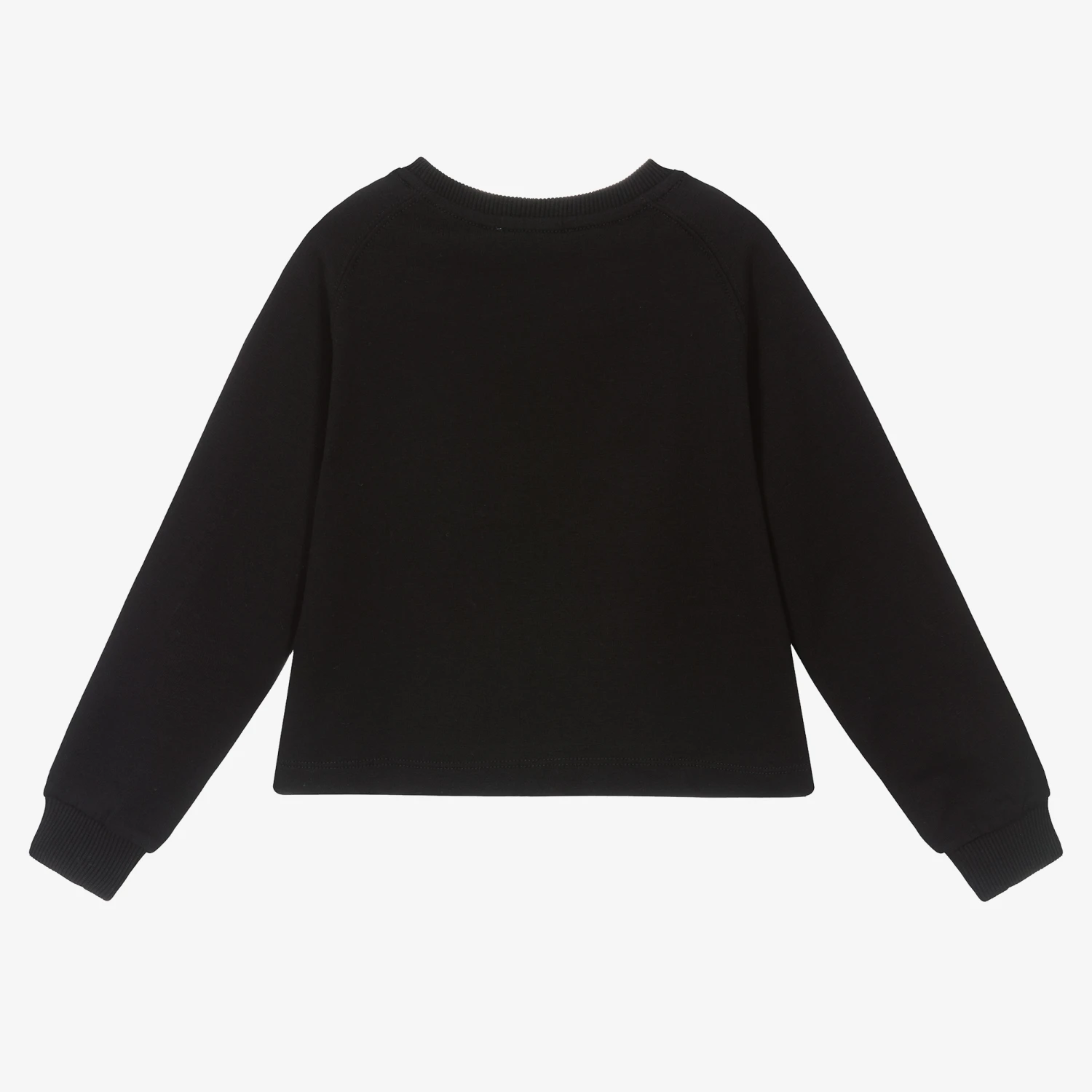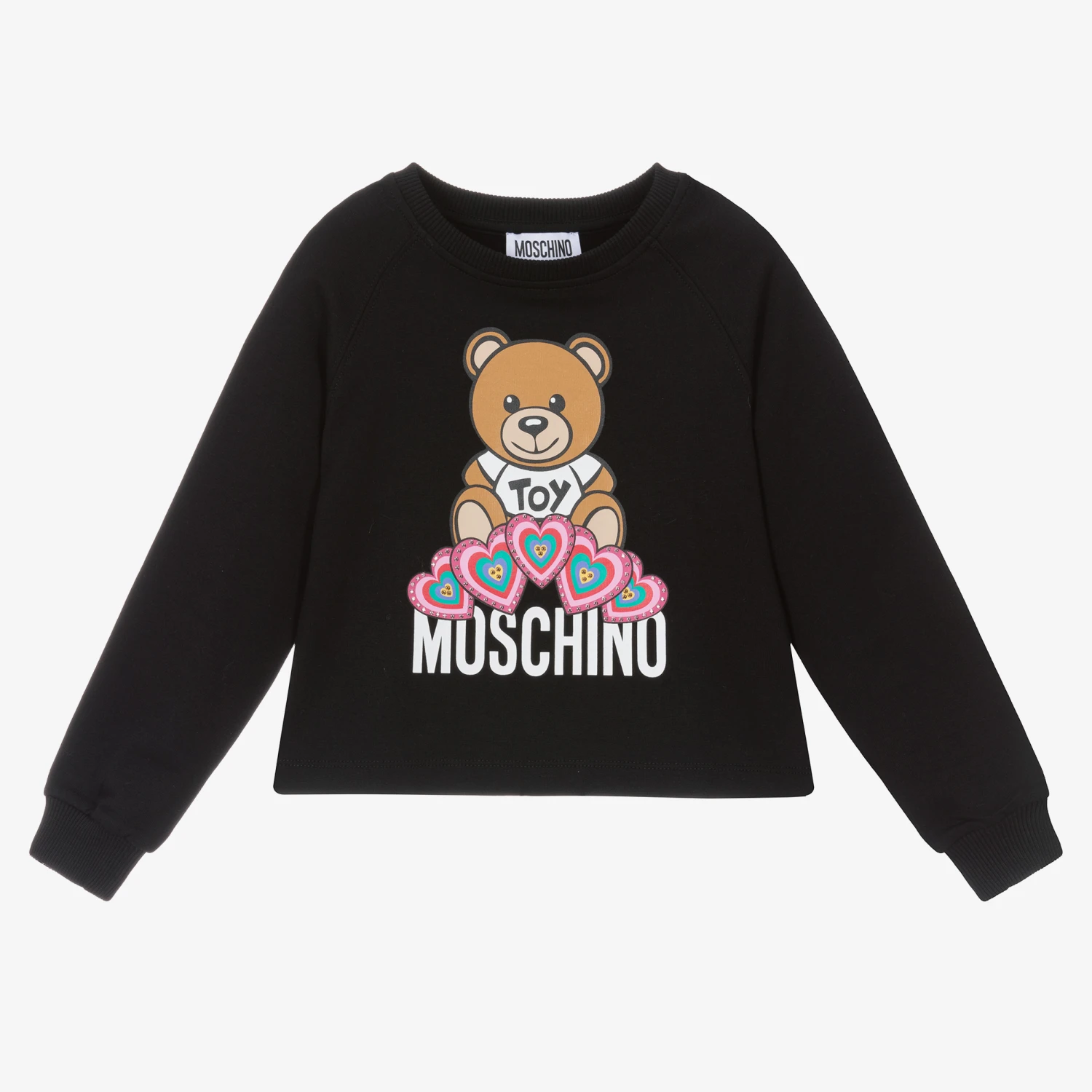 Black cotton sweatshirt for girls from luxury brand Moschino Kid-Teen. Made in mid-weight jersey, it is comfortable and easy to wear, with a large colourful Moschino Teddy Bear printed on the front for brand recognition.Â