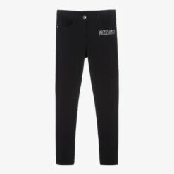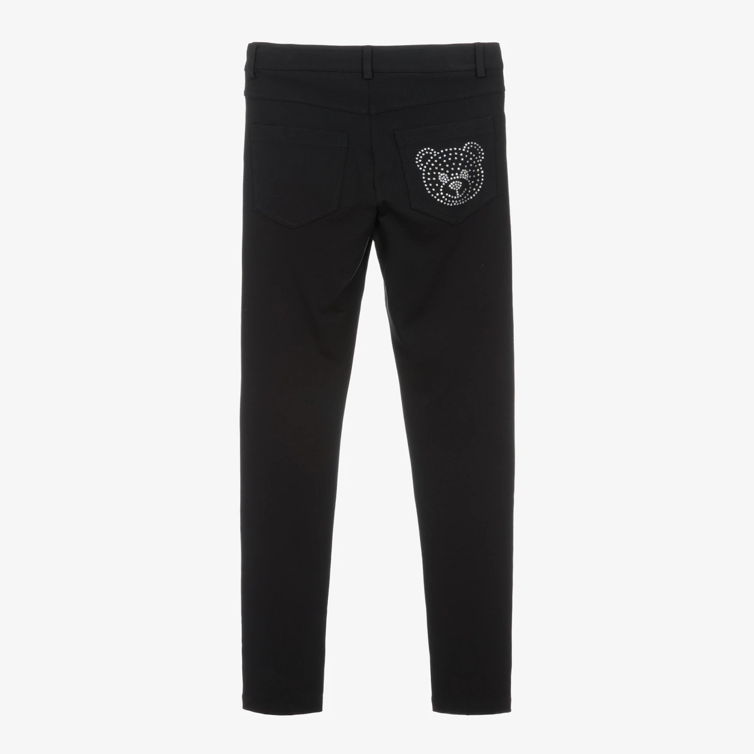 Black viscose jeans for girls by luxury Italian brand Moschino Kid-Teen, with a sparkling rhinestone logo on one leg and a matching Teddy Bear logo on one of the back pockets. Made in a soft, comfortable, viscose-blend Milano jersey, they fasten on the front with a silver logo popper and zip.