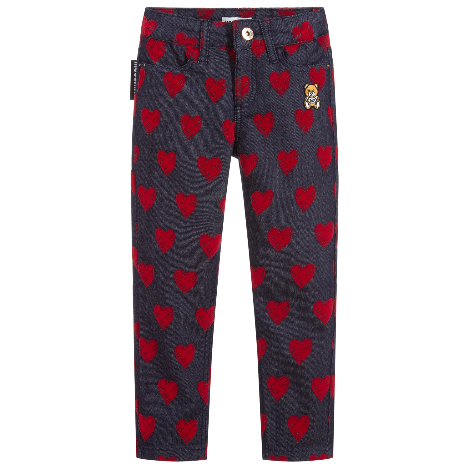 Dark blue jeans for girls by Moschino Kid-Teen, made in a stretchy denim cotton blend. They have a red velvet heart pattern, and a Teddy appliqué on one leg, with pockets on the front and back.