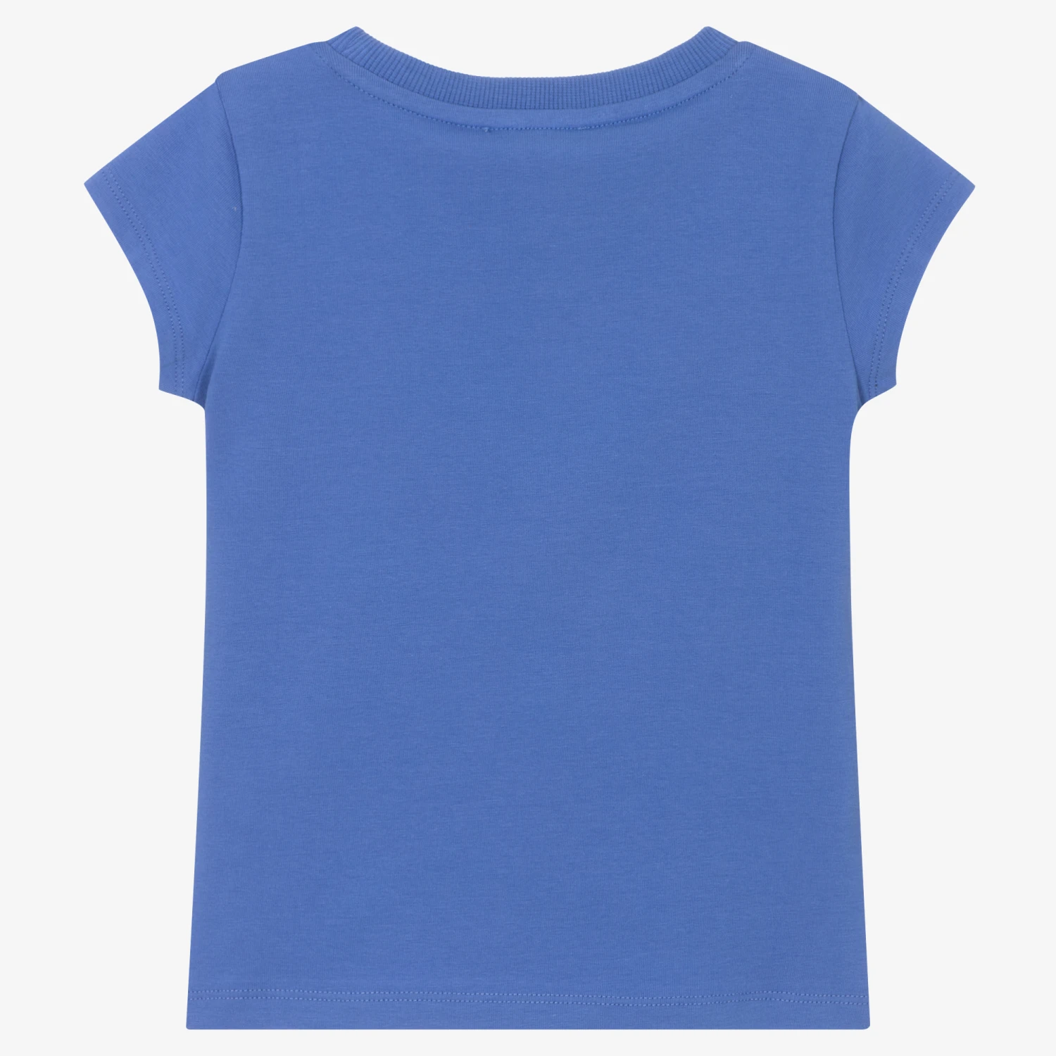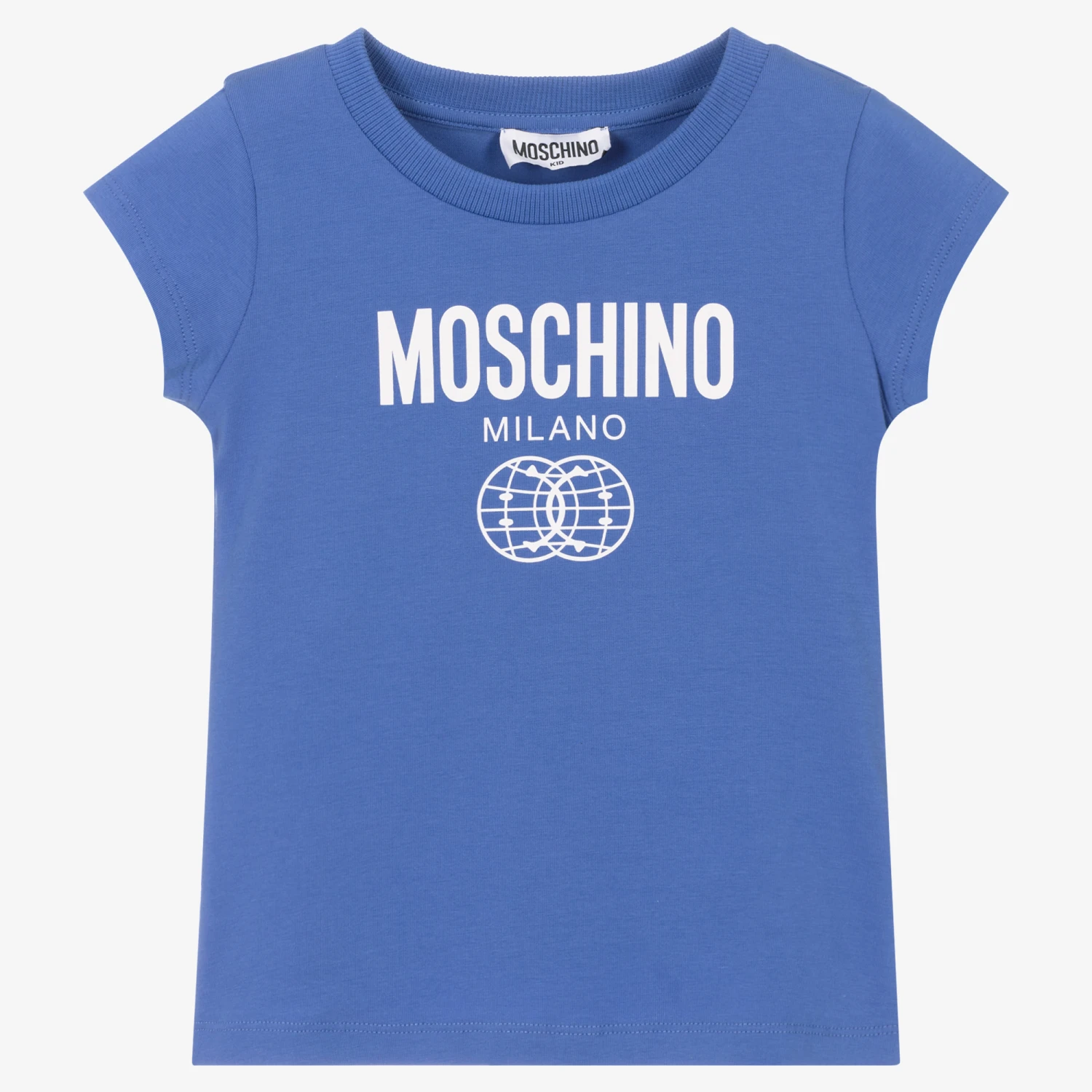 Mini-me purple T-shirt for girls by Moschino Kid-Teen, made in soft cotton jersey. The front is printed with the instantly recognisable spell-out logo in white, featuring the Double Smiley motif underneath for a logo-inspired look.