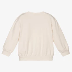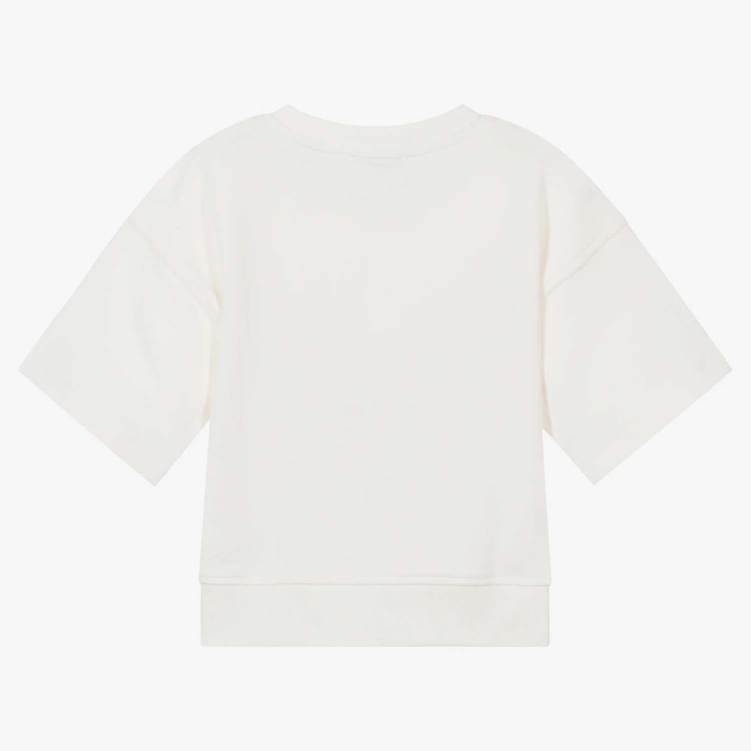 Ivory short-sleeved sweatshirt for girls by Moschino Kid-Teen, made in soft mid-weight cotton jersey. This comfortable top has a fun oversized Moschino Teddy Bear bouclé appliqué on the front, for instant designer appeal. Ideal for relaxed days, it has a casual crew neck and a stretchy ribbed hem.