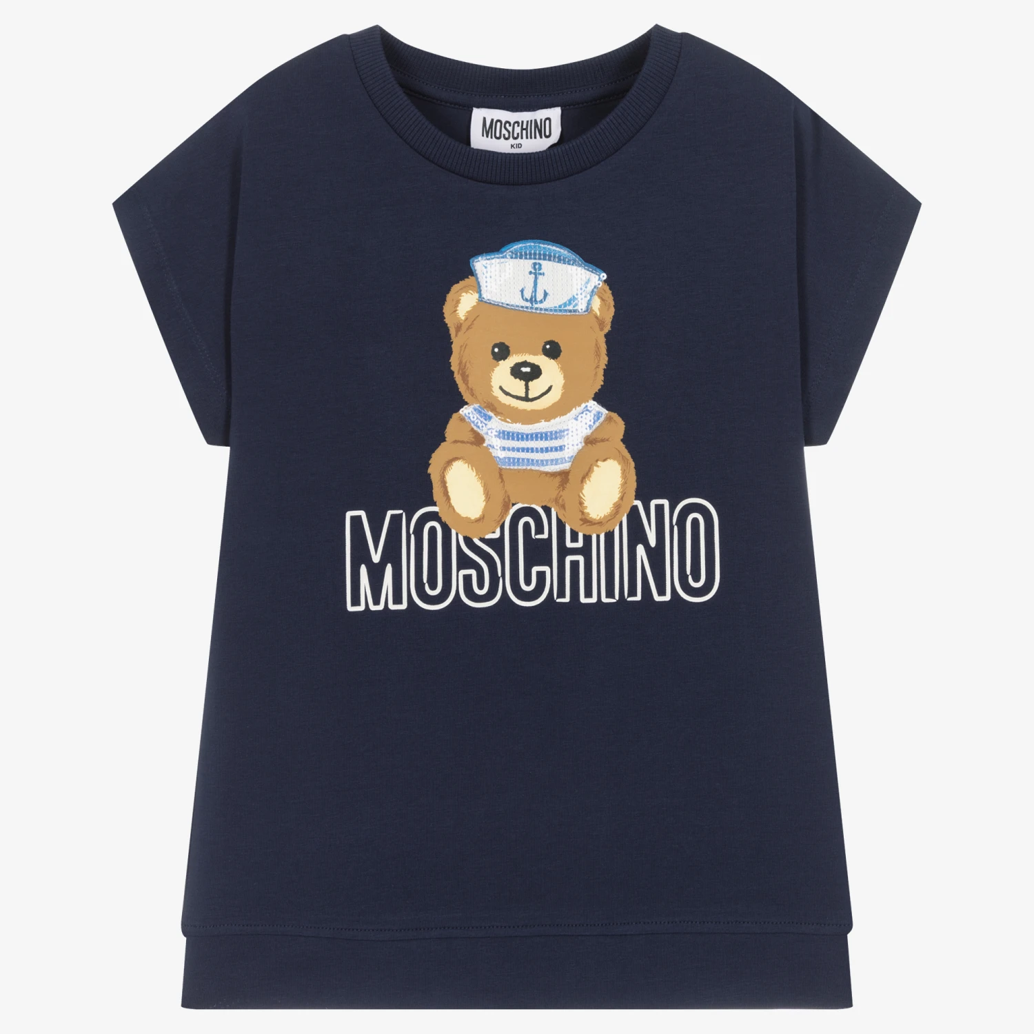 Girls navy blue cotton jersey maxi T-shirt by Moschino Kid-Teen, with seamless sleeves. The brand’s signature Moschino Teddy Bear motif is printed on the front in a nautically-themed sailor hat and sweater, adorned with sparkly light blue sequins and a logo is printed underneath.