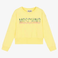 Pretty yellow sweatshirt for girls by Moschino Kid-Teen, made in soft cotton jersey. This cropped style has a lovely logo appliqué on the front depicting a sweet sunshine garden. Sparkling rhinestones add a girly, statement touch to this comfortable wardrobe staple.