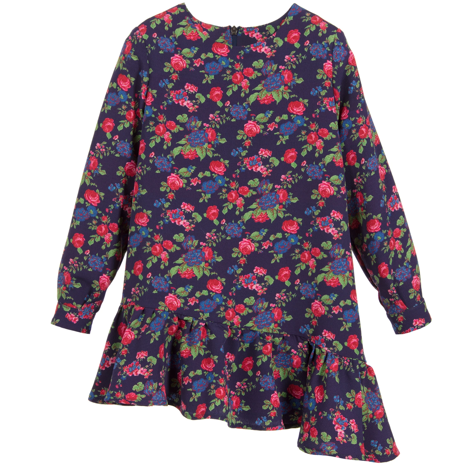 A pretty floral dress for girls from MSGM, made in lightweight crêpe de chine. This mini-me inspired design is floaty and cool, with a smooth lining for comfort. The ruffle hemline has an asymmetric cut and the long sleeves have button fastenings at the wrists, with a concealed back zip to fasten.