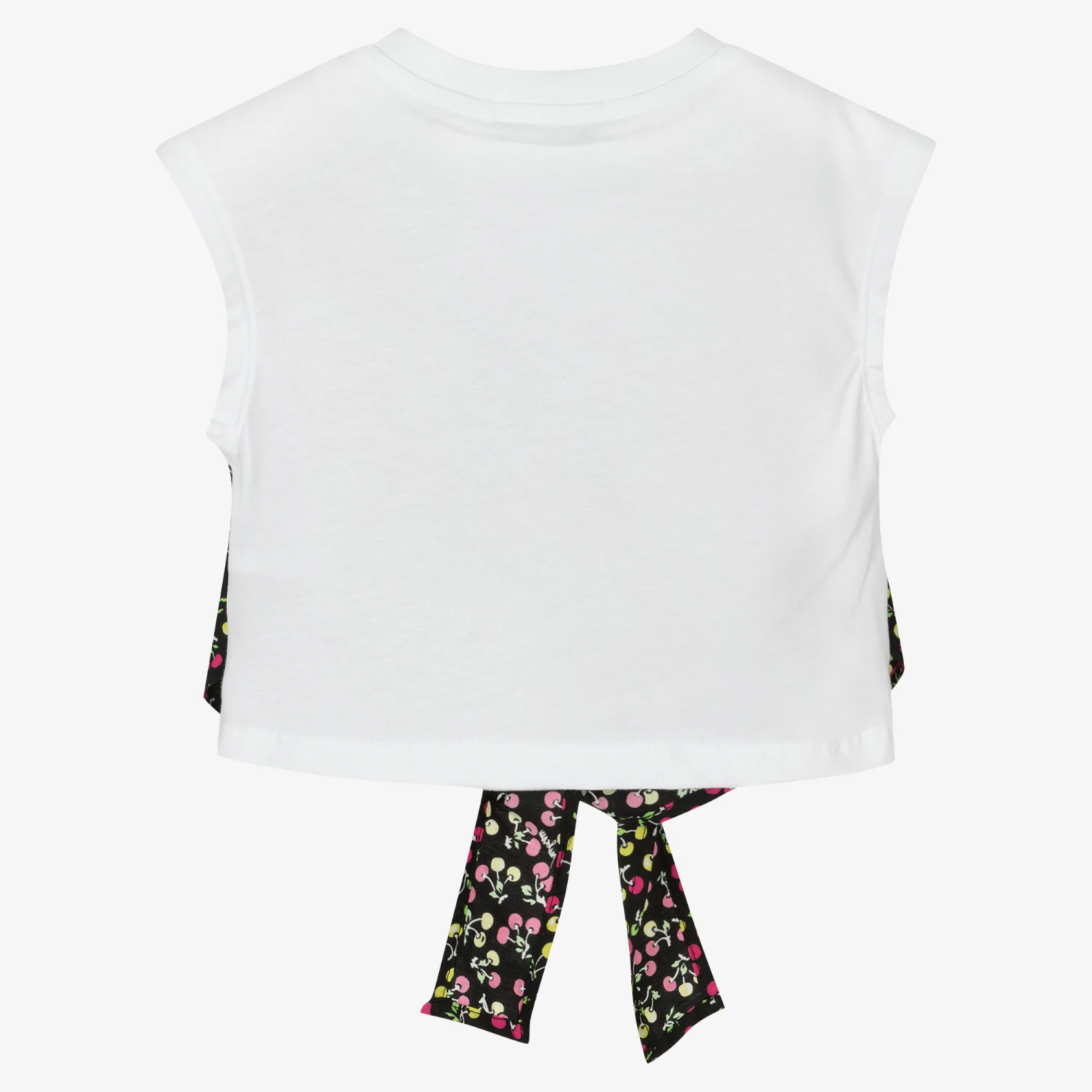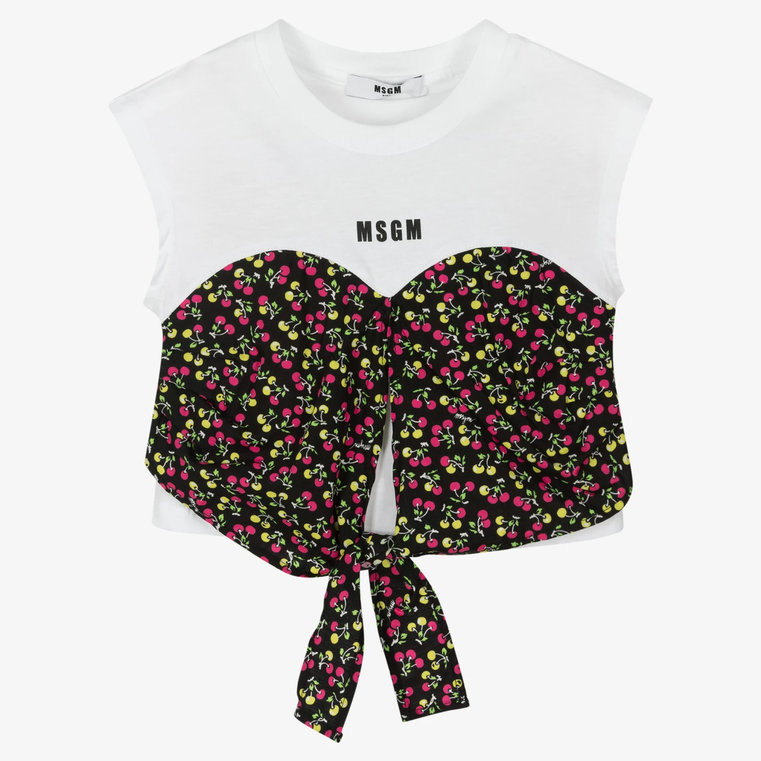 White sleeveless top for girls by MSGM, made in soft cotton jersey. The front features a black panel, patterned in a pink and yellow micro cherry print, with a stylish tie knot detail. This slightly cropped design has a classic crew neckline, with a black micro logo print on the front for a signature look.
