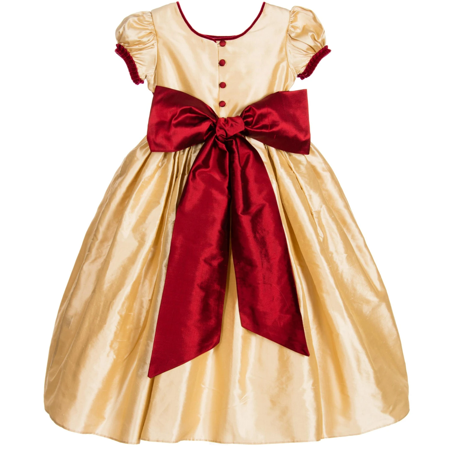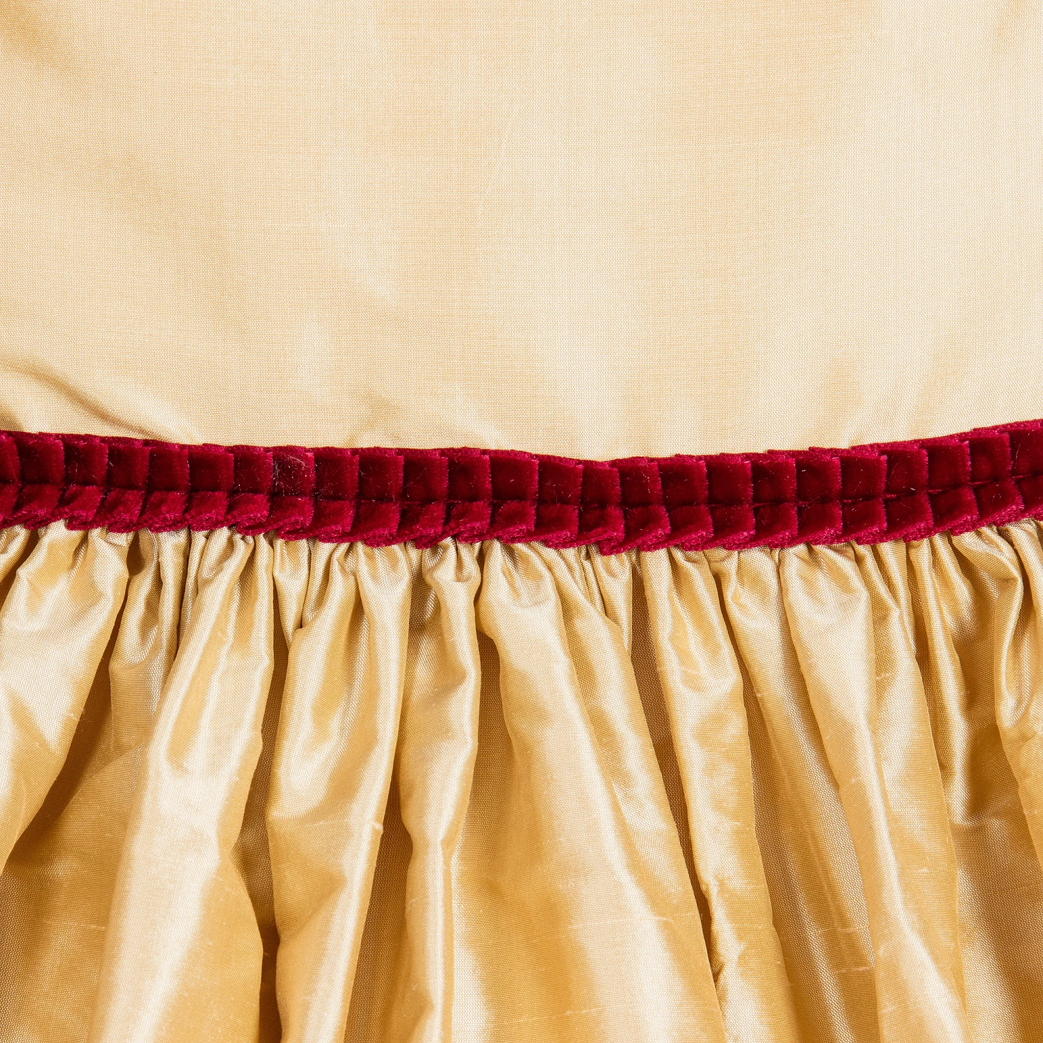 A stunning gold and dark red silk dress for girls by Nicki Macfarlane. It has puffed sleeves and pleated red velvet trim. The flared skirt has layers of ruffled tulle, with delicate lace. There are red silk covered buttons fastenings and a sash that ties into a bow. It is made in pure silk, which means there may be some natural imperfections within the fabric.