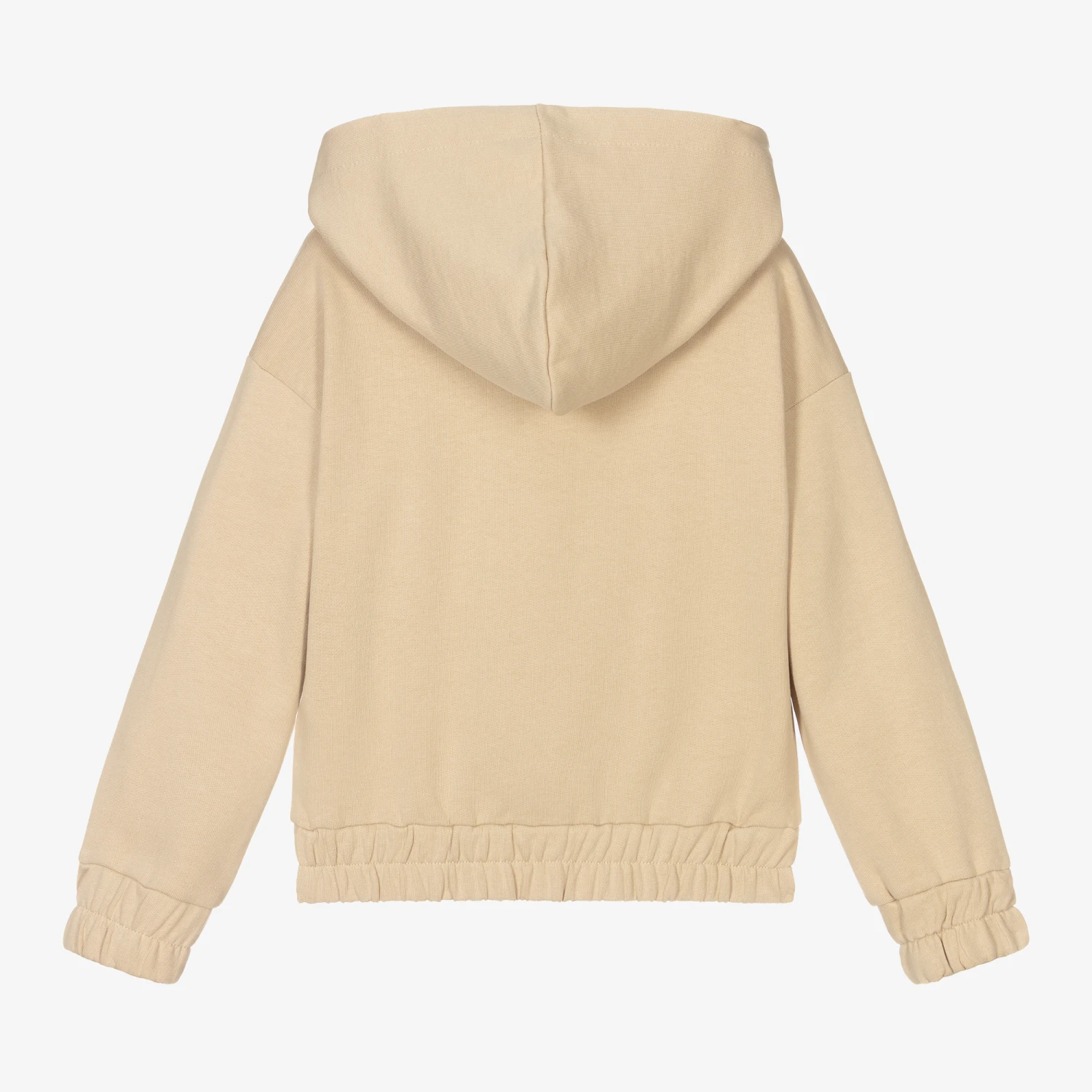 Beige hoodie for girls by NIK&NIK, made in mid-weight cotton sweatshirt jersey. It has a white logo printed on the front and another on the back of the neck and the hem and cuffs are elasticated.