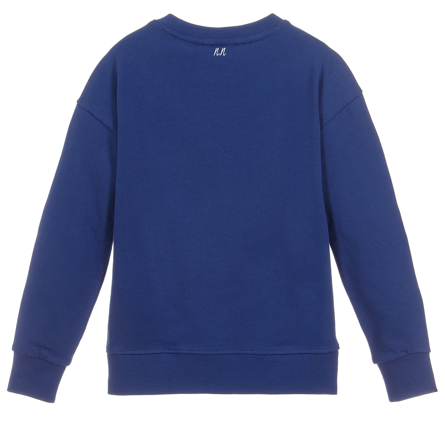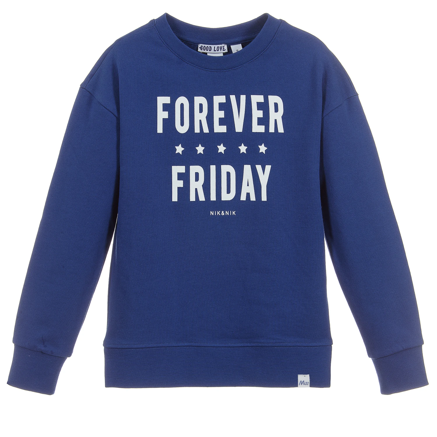 Girls blue cotton jersey sweatshirt by NIK&NIK, with a white ‘Forever Friday’ and logo print. It has split seams on the hem for comfort and ease of movement.