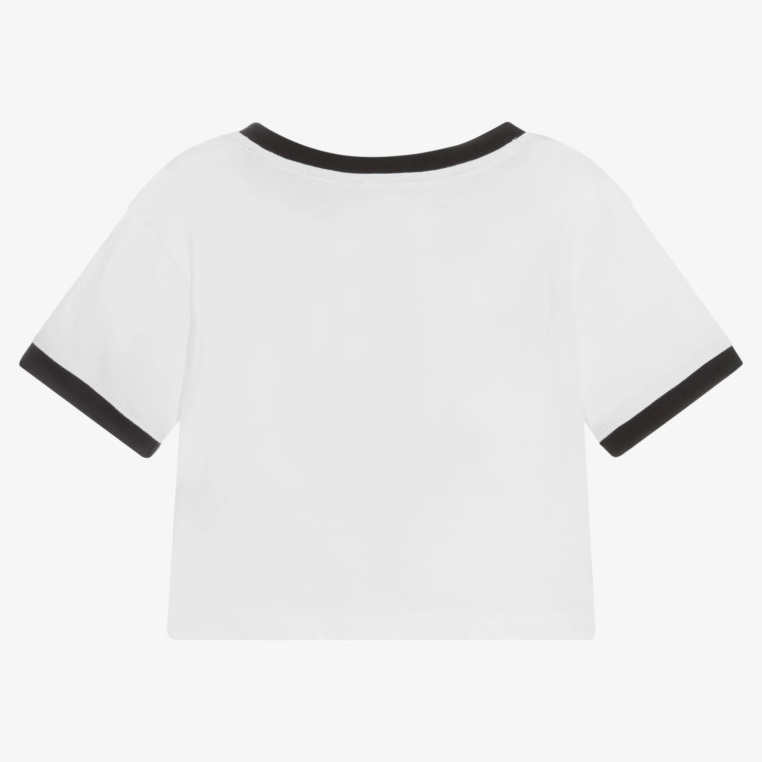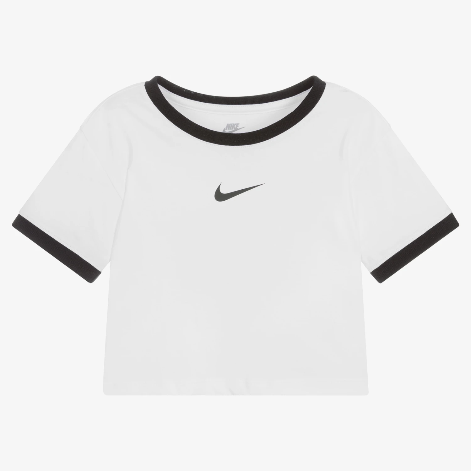 Instantly recognisable, a white boxy-fit T-shirt for girls with a black Swoosh logo print by Nike. Casual and comfortable, it is made in soft cotton jersey with black ribbed trims.