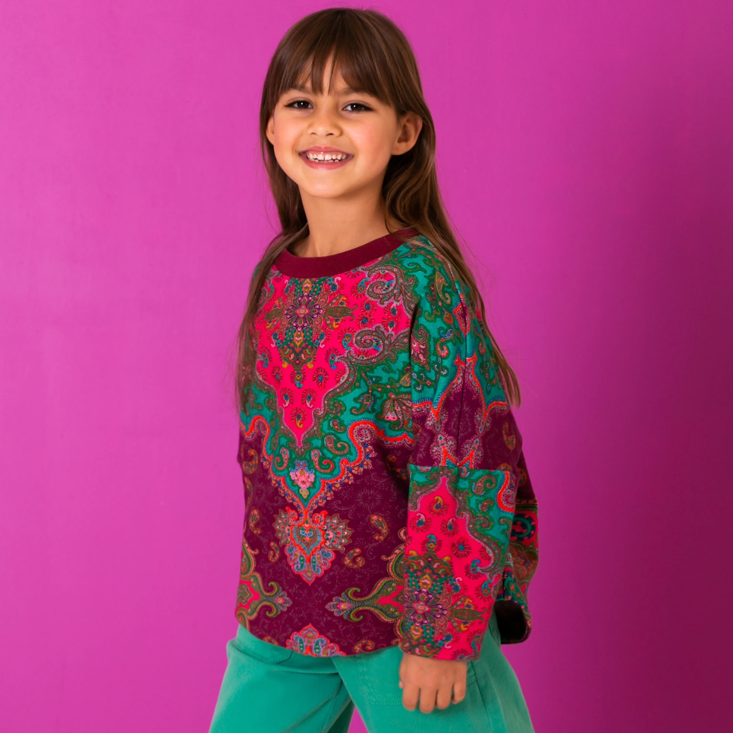 Beautiful pink, green and purple sweatshirt for girls by Oilily, with an elaborate Paisley pattern. Made in soft, stretchy cotton jersey with dropped shoulders, it is both comfortable and stylish.