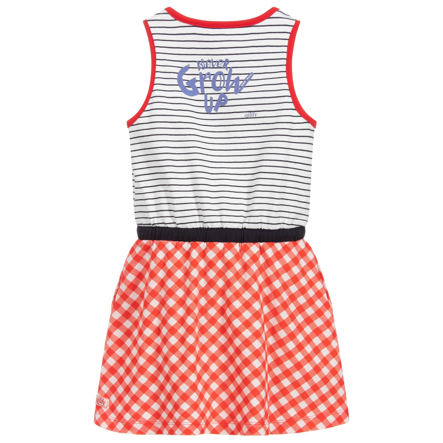 Charming sleeveless dress for girls by Oilily, made in soft organic cotton jersey. The skirt has red and white checks and the top has a navy blue and white striped design with red trims around the arms and neck. It has a drawstring waist and girl in a window print on the front. The brand’s ‘Never Grow Up’ logo is printed on the back.