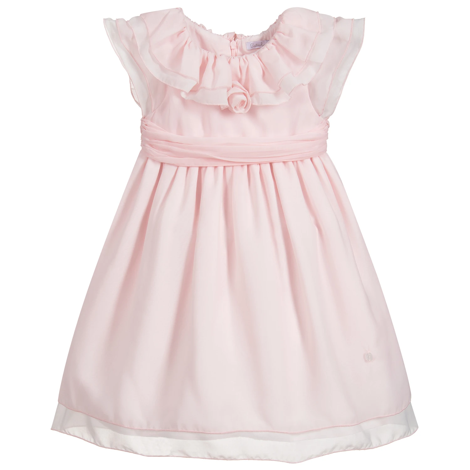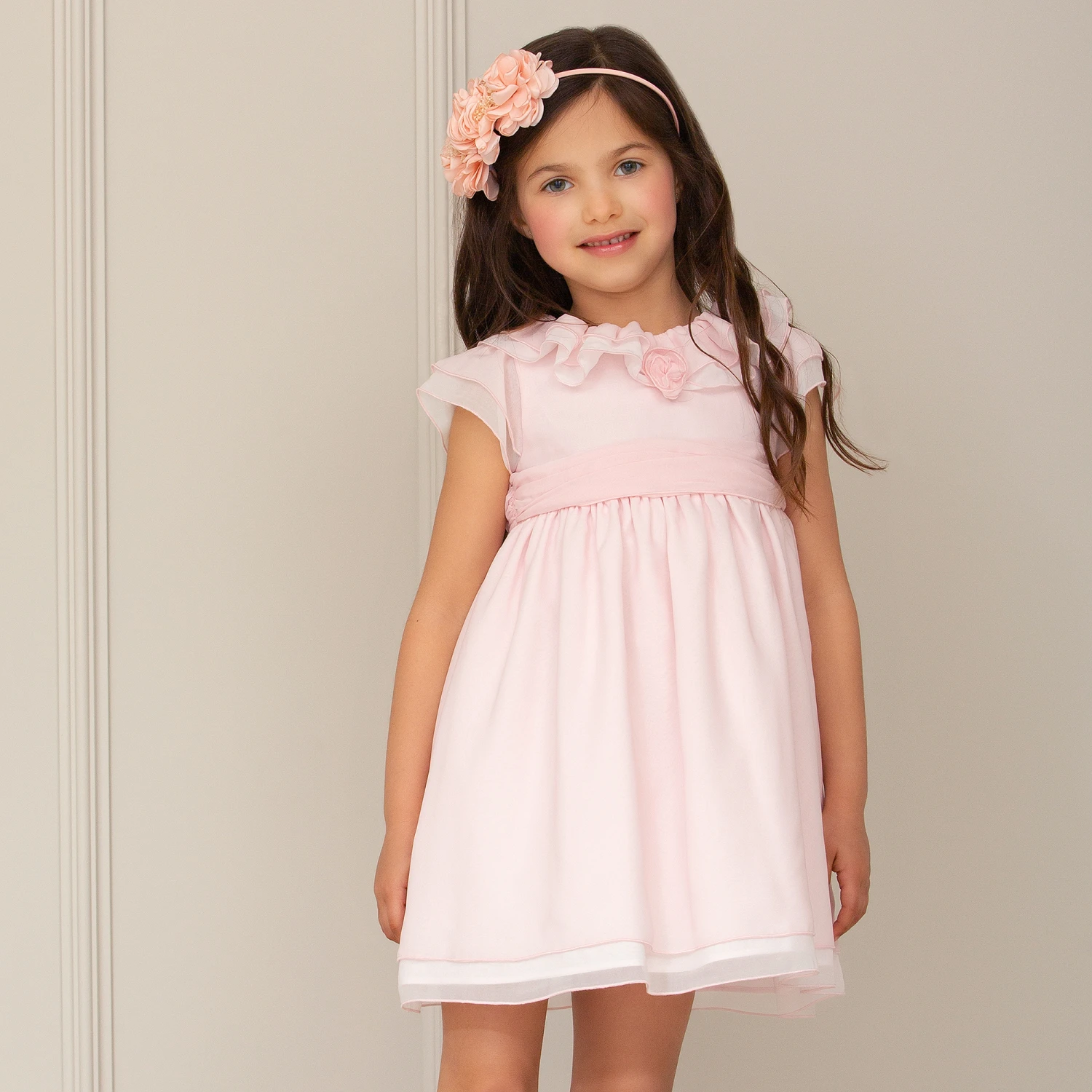 Ideal for a girl’s special occasion, a beautiful pale pink chiffon dress with a lightweight cotton and tulle lining by Patachou. It has pretty ruffle trims across the collar, with a fixed sash that ties at the back.