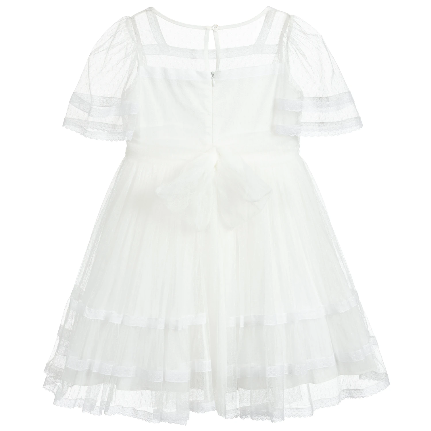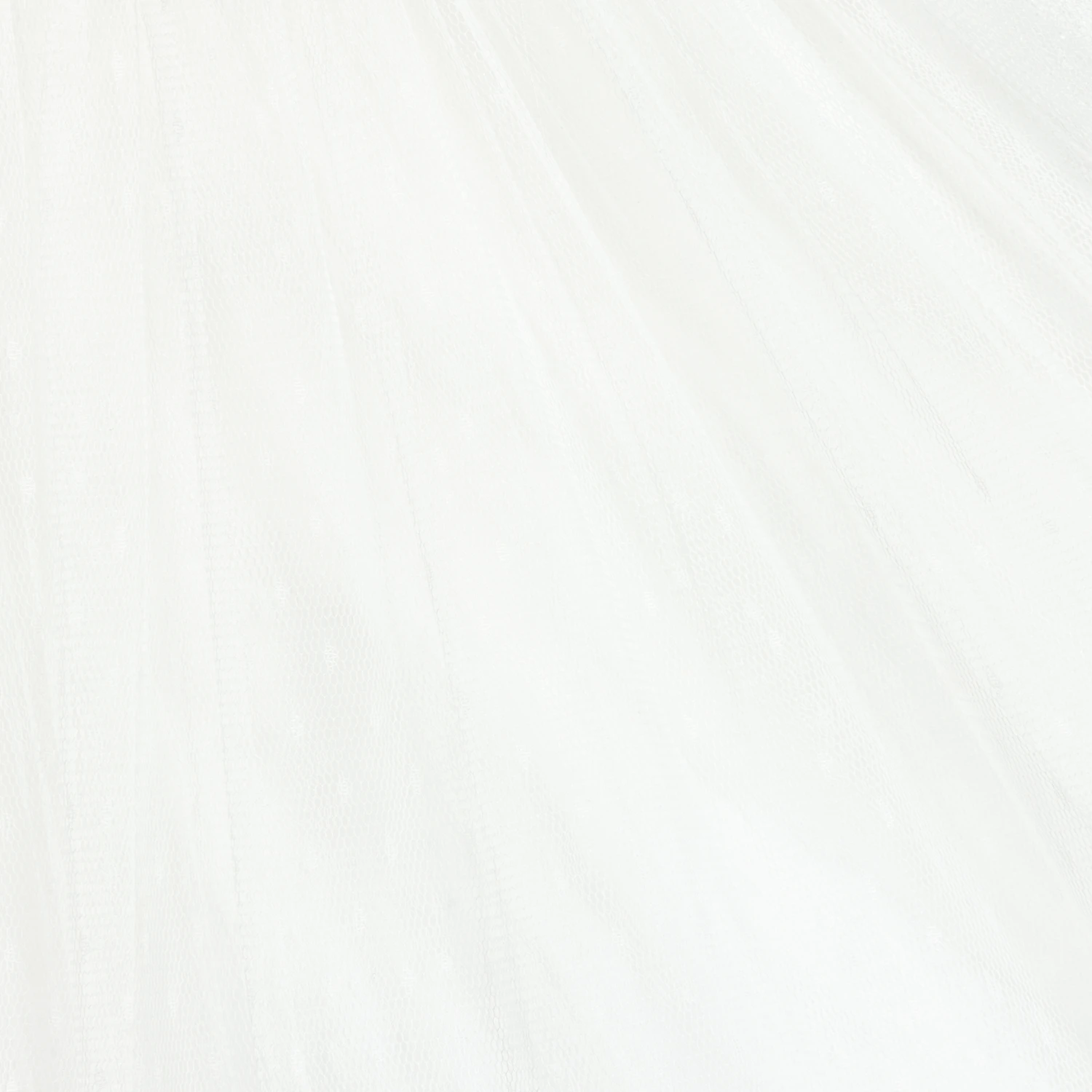 Ideal for a girl’s special occasion, a beautiful white tulle dress with a lightweight cotton lining by Patachou. Soft, with a delicate dots pattern, the dress has sheer sleeves with gorgeous floral appliqué on the front. There is a net trim underneath for added volume and a fixed sash, which ties into a bow on the back.