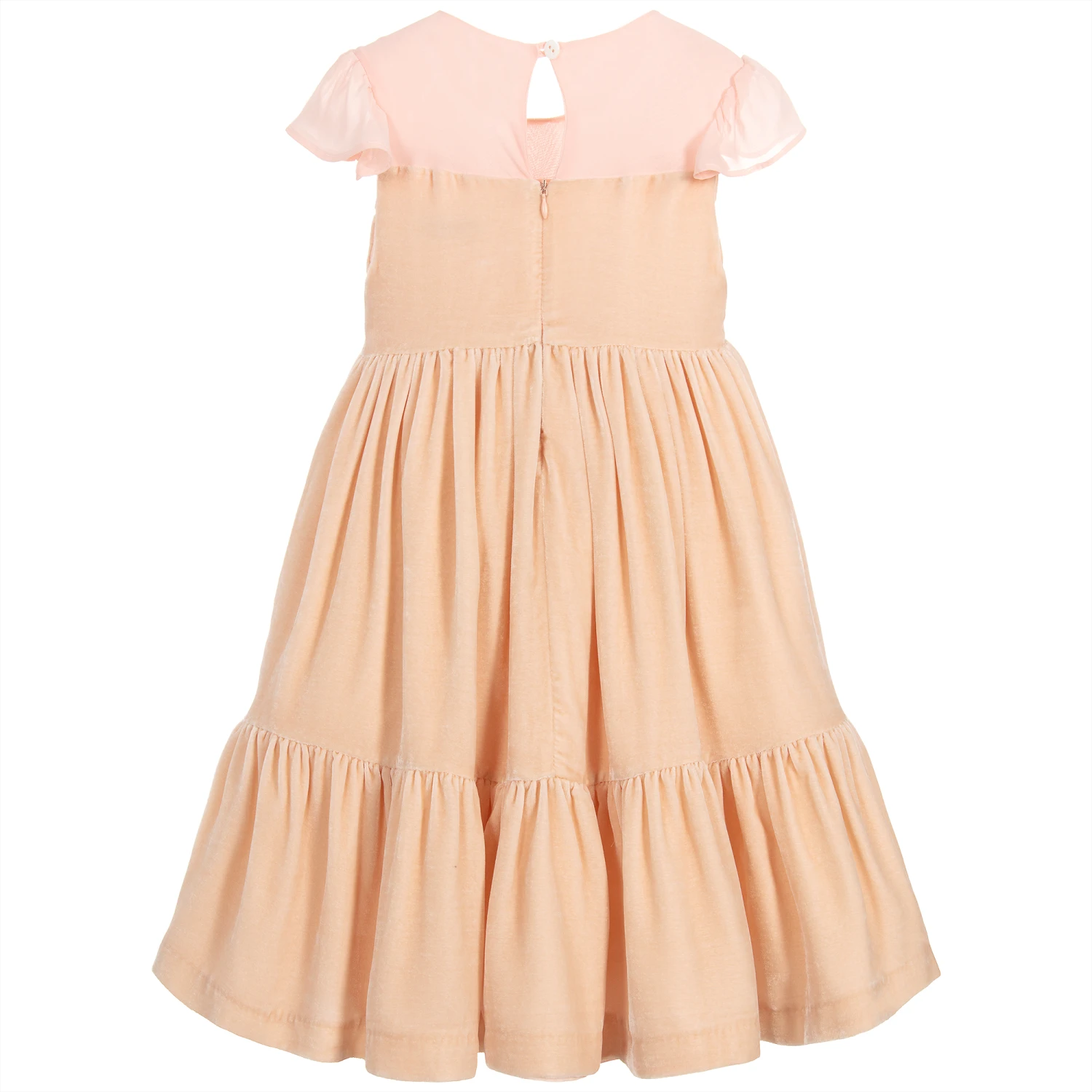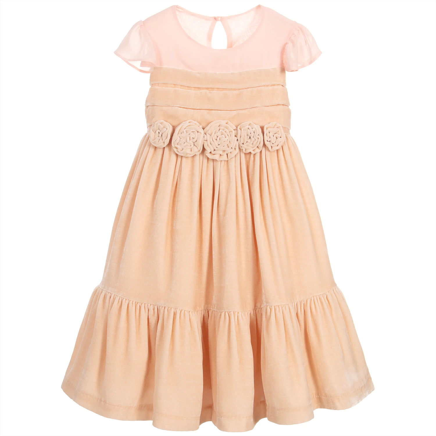 Made in beautiful, salmon pink silk velvet, this gorgeous dress by Patachou Haute Couture has a beautiful pleated bodice with rose appliqués and a full length skirt. It has pretty chiffon panels over the shoulders and is lined in fine cotton with a tulle frill for extra volume.