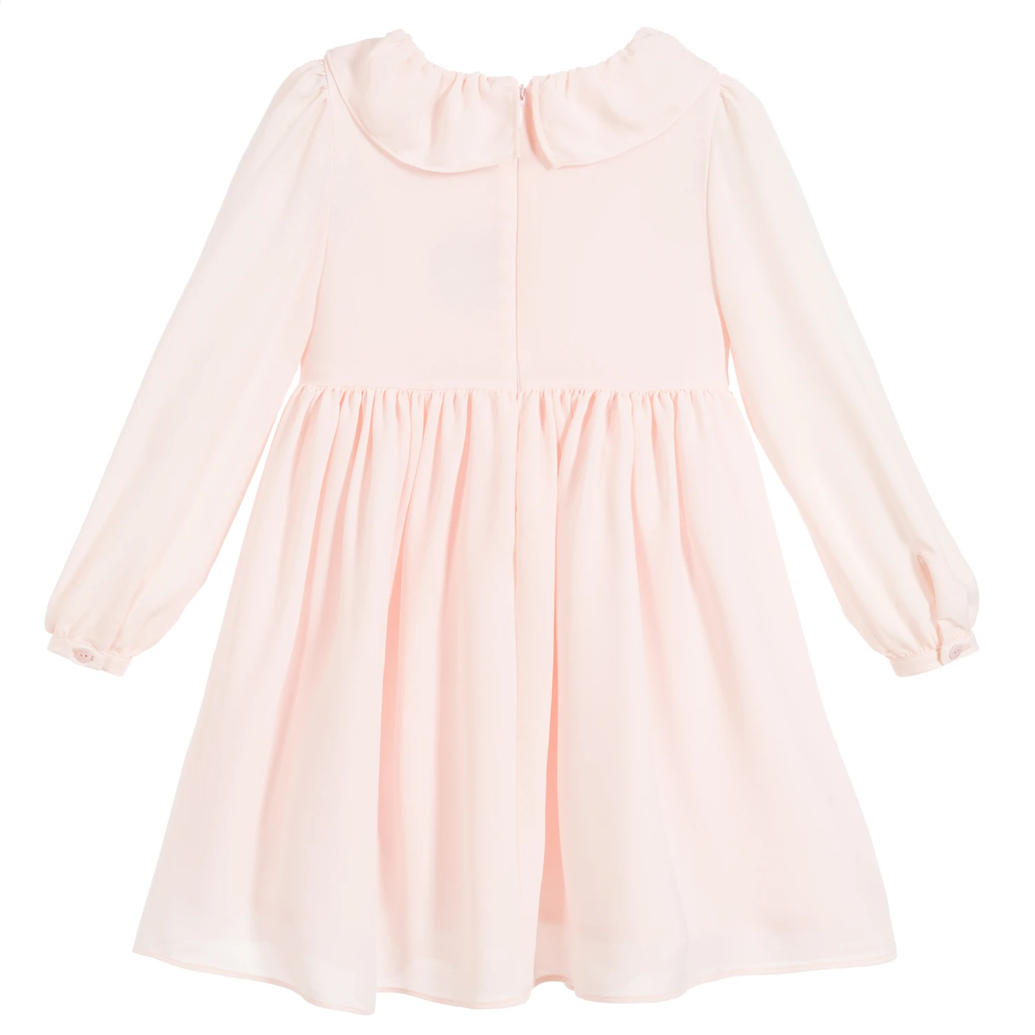 Girls long sleeved smart pink dress by Patachou, made in a lightweight and flowy chiffon crêpe. The bodice is pleated on the front with a gathered waist and a bow on the ruffled collar.