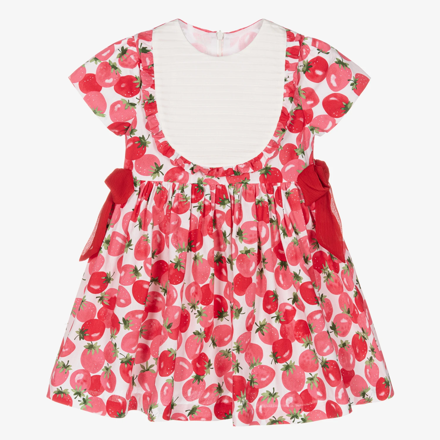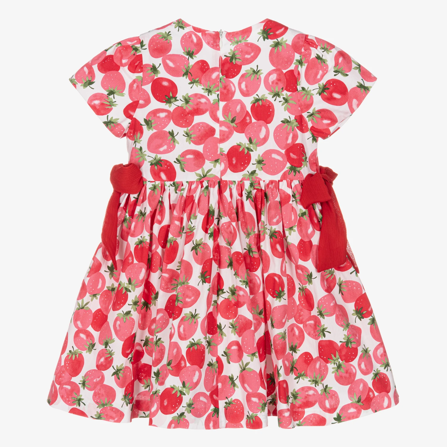 Patterned with red and pink strawberries, a beautiful dress for girls from Piccola Speranza. Made in lightweight organic cotton poplin, this classic style has a white pintuck bib with frilled trim, capped sleeves and pretty red chiffon bows at the sides. It is lined in lightweight cotton for comfort and fastens with a concealed zip on the back for a neat finish.