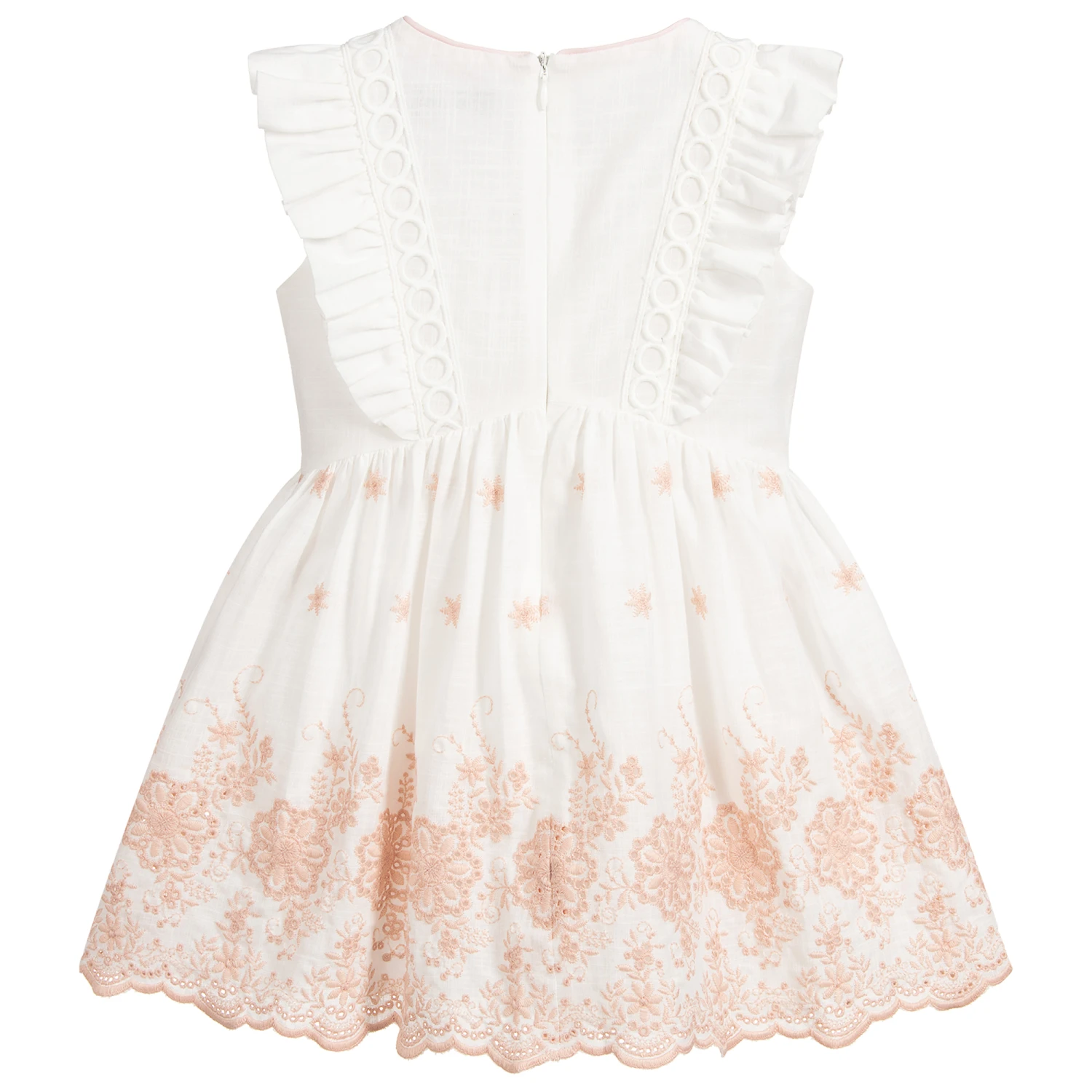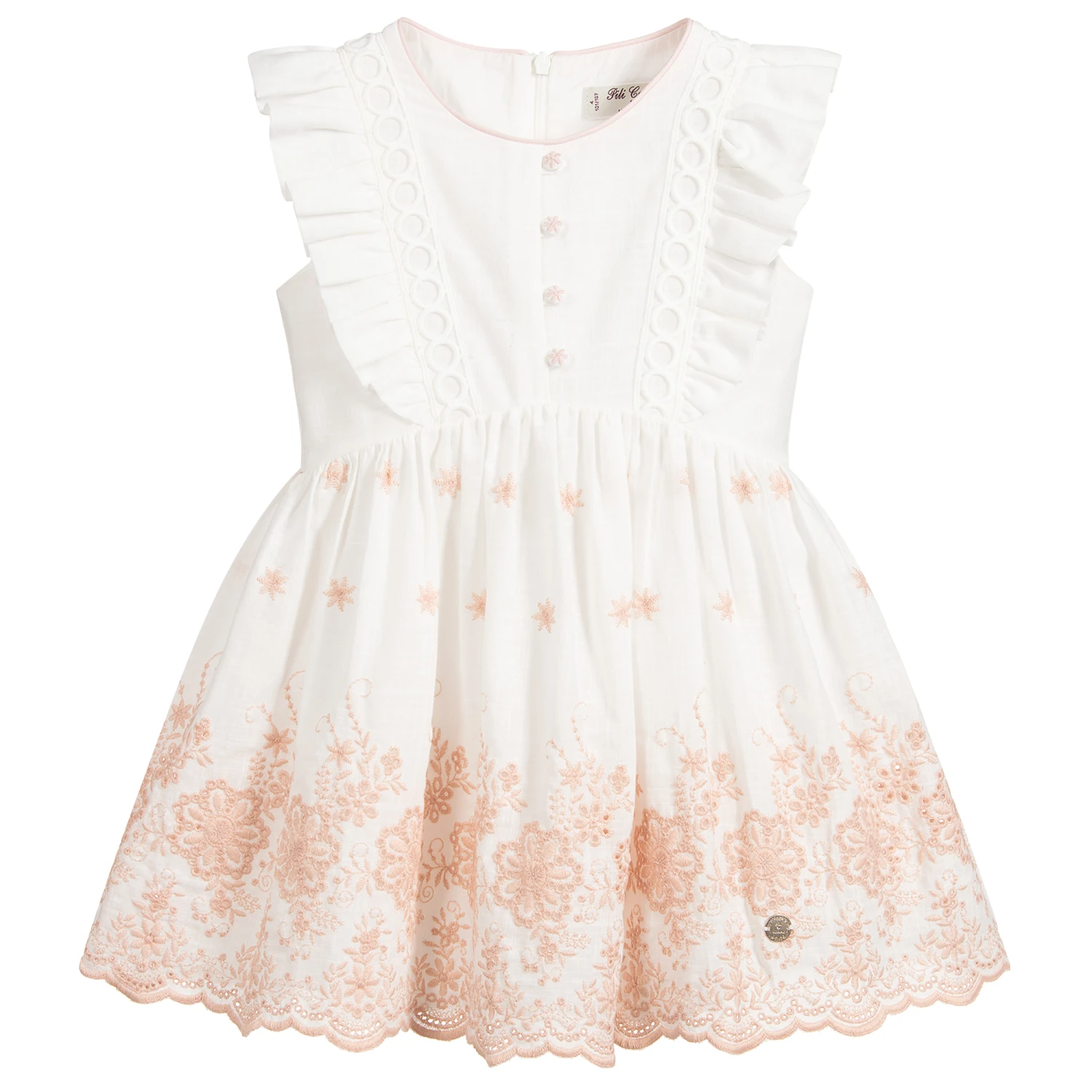 Gorgeous ivory dress for girls by Pili Carrera, with pretty pink embroidery. Made in a cotton blend and fully lined, it has a fitted bodice, ruffle shoulders and back zip fastening.