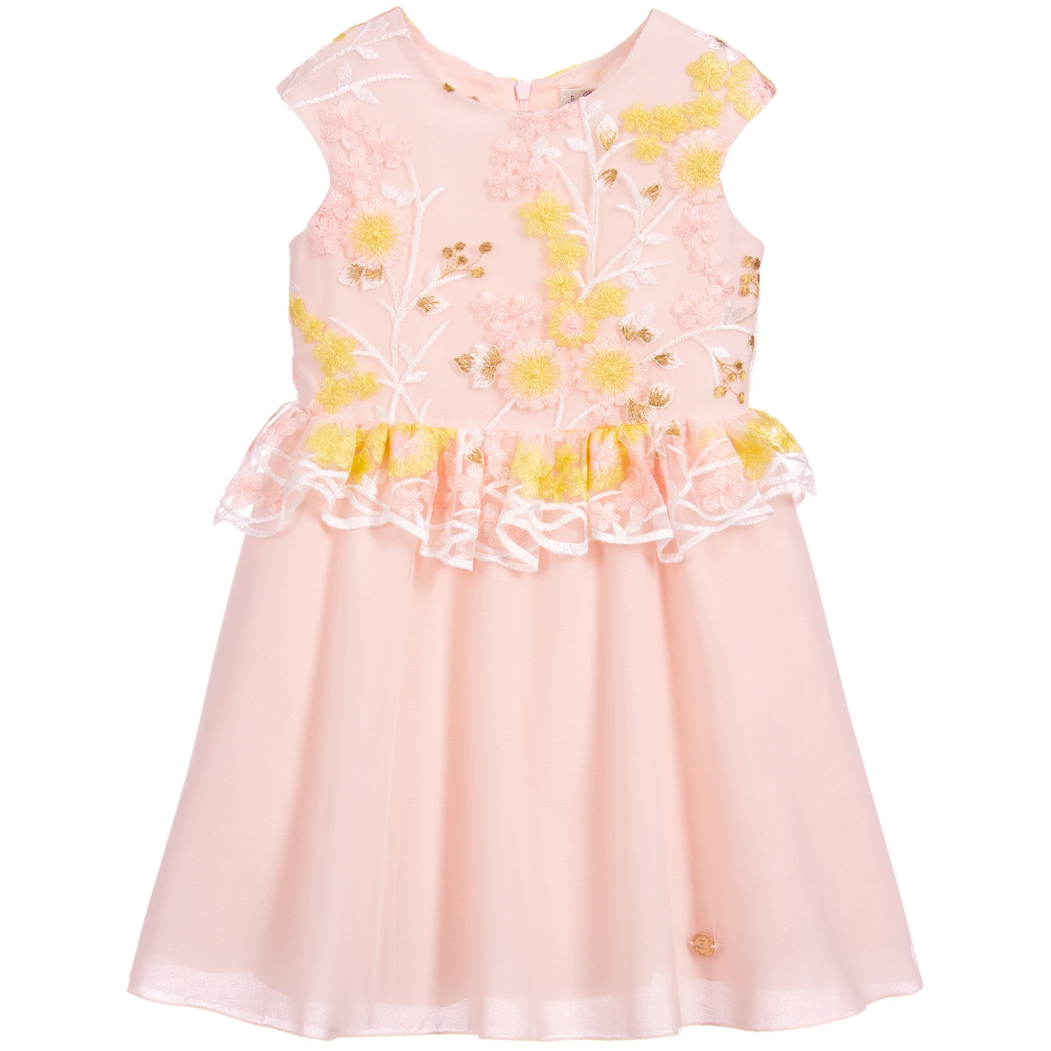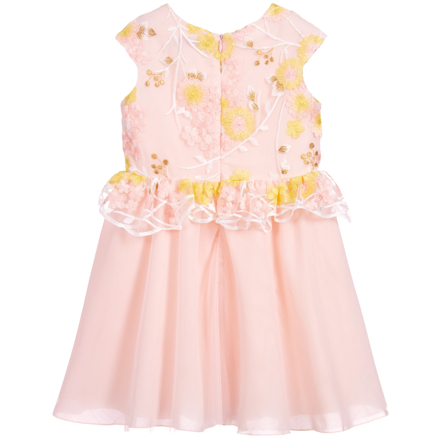 Girls pink dress by Pili Carrera, made from soft and lightweight cotton, with a soft tulle overlay embroidered yellow and pink flowers.