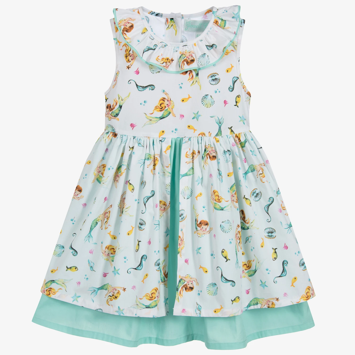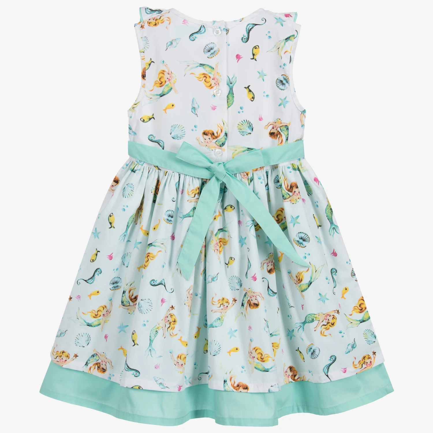 Younger girls white, green and yellow dress, made in soft, lightweight cotton by Powell Craft. It has a delightful vintage mermaid print and mint green trim on the ruffled collar. There is a matching sash tie belt on the back and full layered skirt.