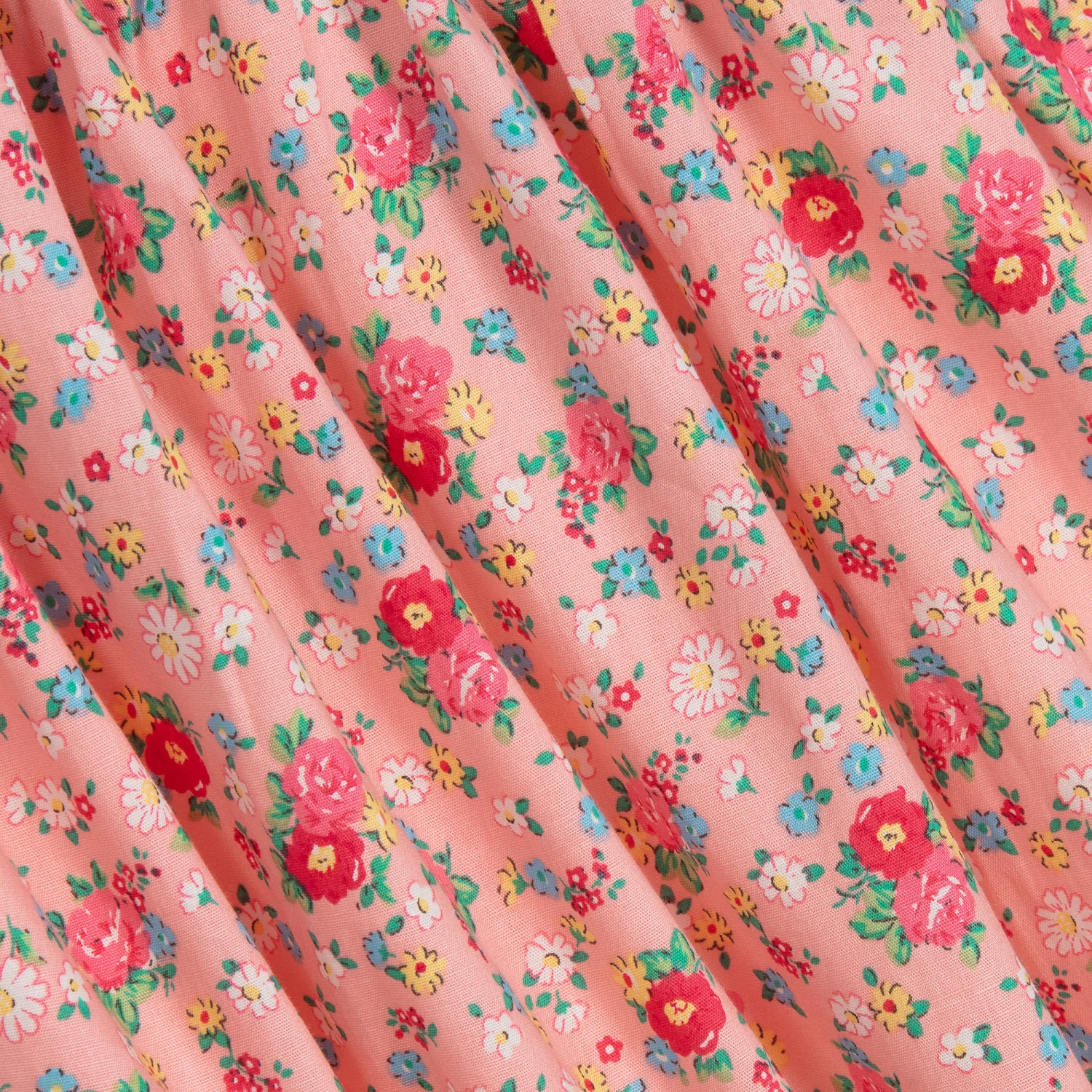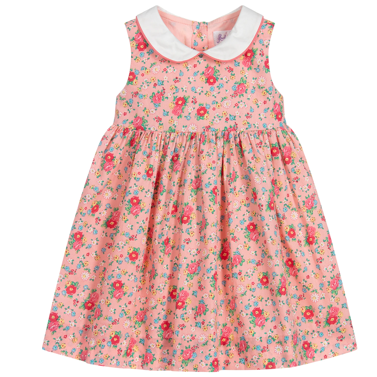Baby girls pink dress and knickers set from Rachel Riley, with a dark pink and blue floral pattern. The dress is made in a double layer of soft and lightweight cotton, with a white collar and pink piped trim. There are buttons and an attached sash belt that fasten on the back.