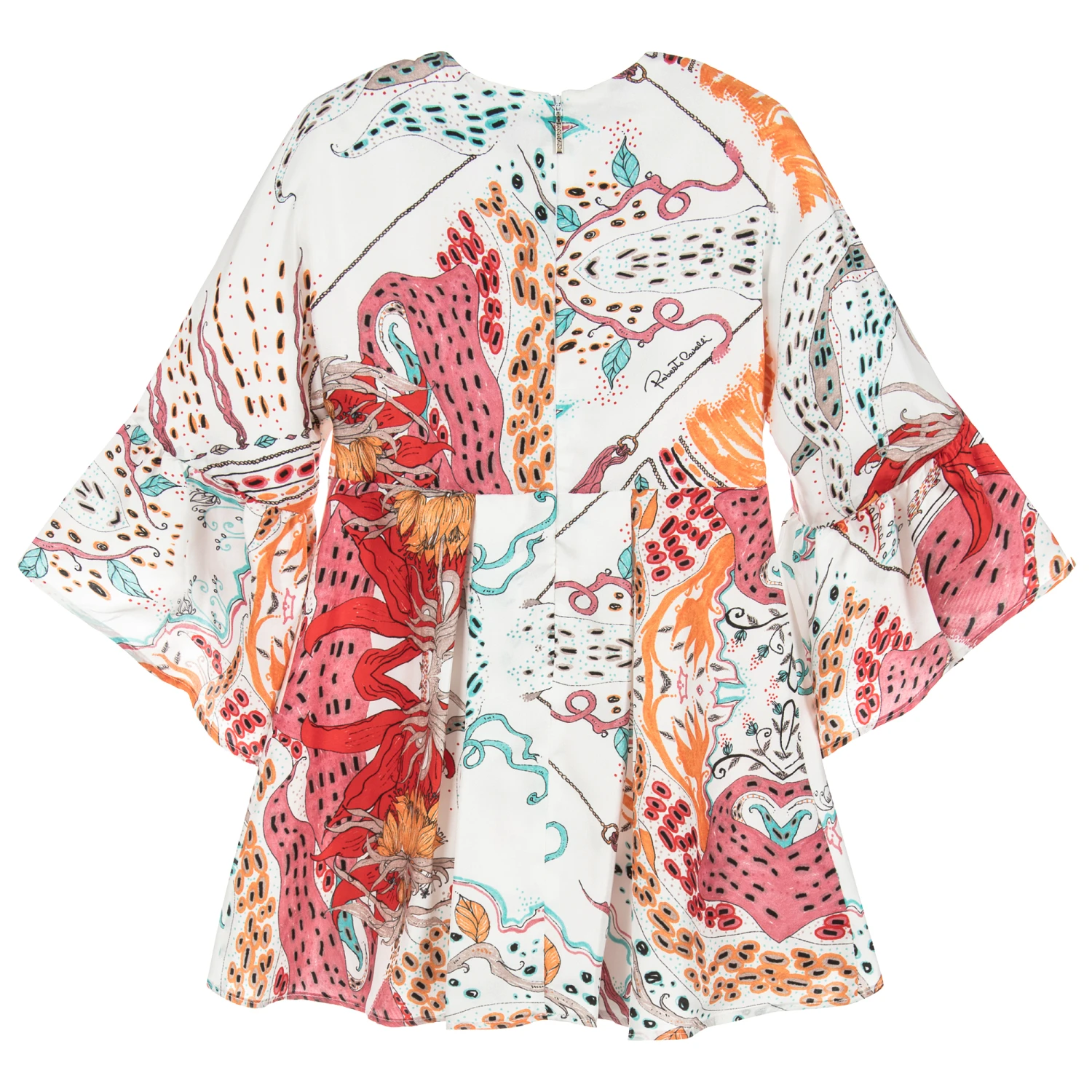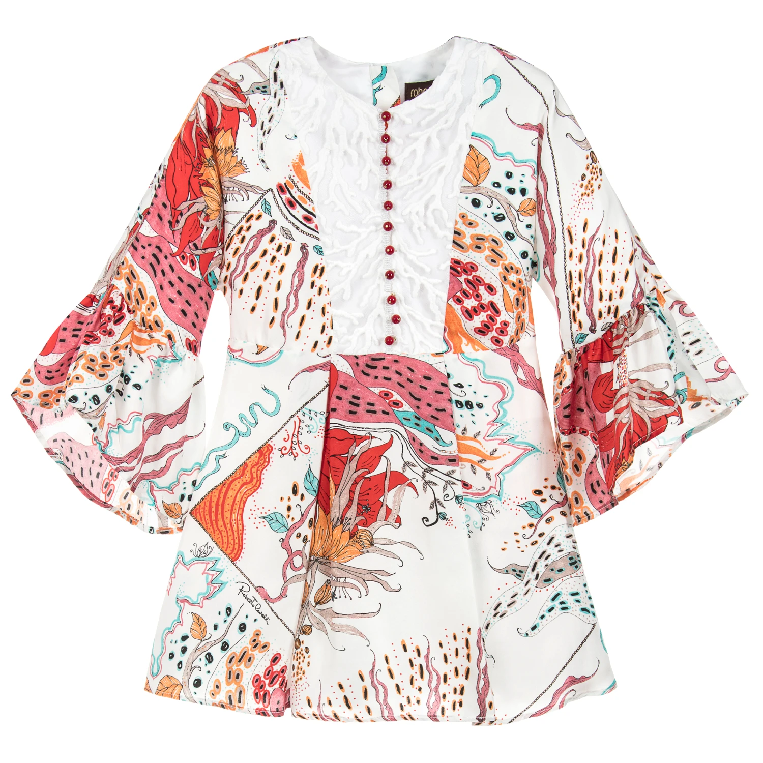 Girls ivory dress from Roberto Cavalli, with a pink and red ‘undersea’ print. Made in luxuriously soft silk, with a lightweight satin lining. The bodice is made of embroidered lace, with red beaded buttons to fasten.