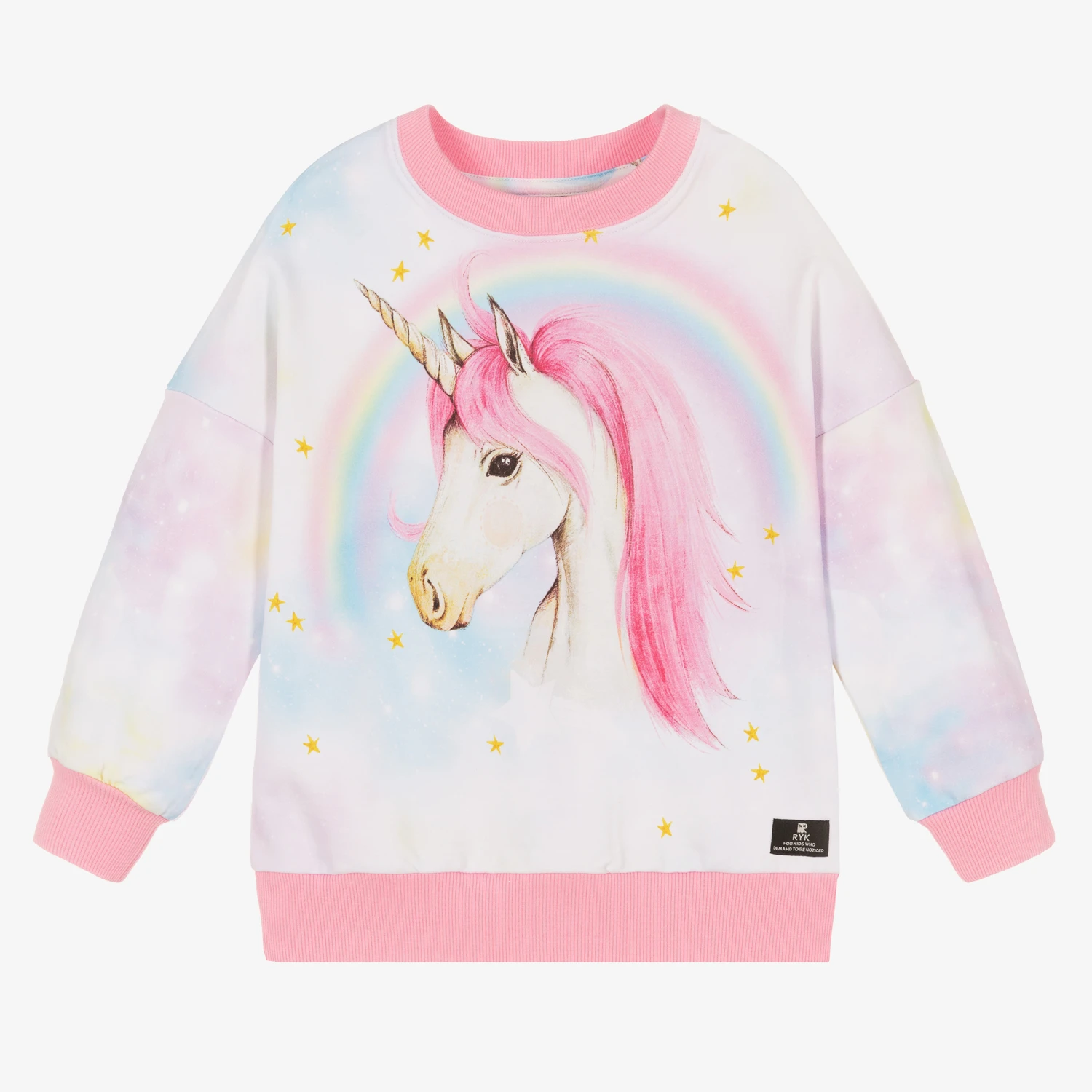 Pink and blue sweatshirt for girls from Australian label Rock Your Baby. Soft, stretchy and comfortable, this cute top is made in medium-weight cotton jersey with dropped shoulders for a relaxed look. In pastel shades of pink, blue and yellow, it has a star, rainbow and pretty unicorn motif. The neckline, cuffs and hem are trimmed with pink ribbed jersey.