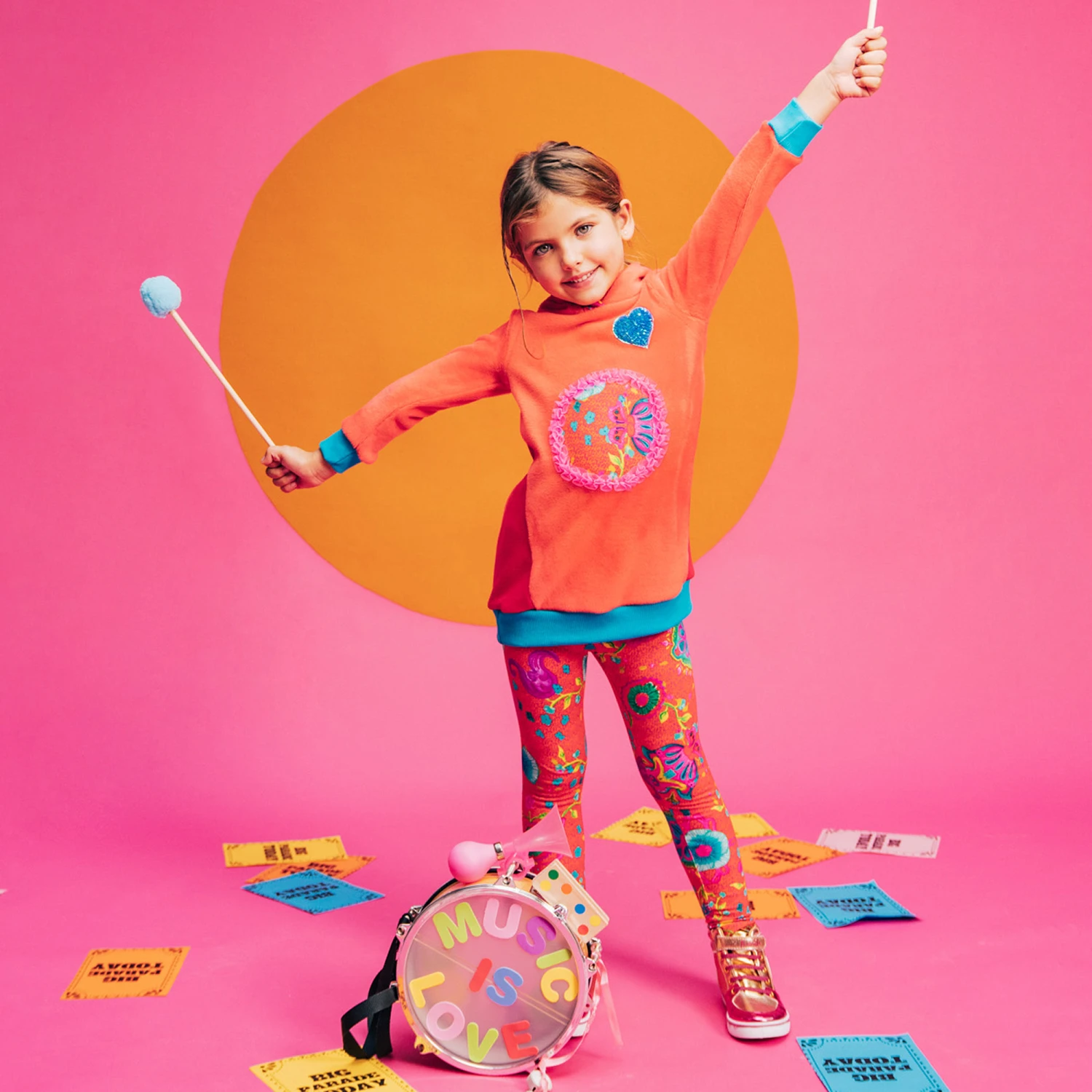 Orange-red velour hoodie for girls by Rosalita Senoritas. Made in a beautifully soft cotton blend, this cosy top has contrast blue ribbed trims and a sequinned heart on the chest. The hood is lined in soft blue fleece and has a colourful floral print trim. There is a matching floral print appliqué on the front, edged in bright pink ruffled tulle.