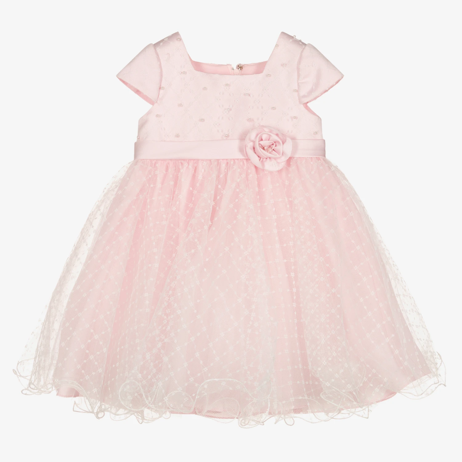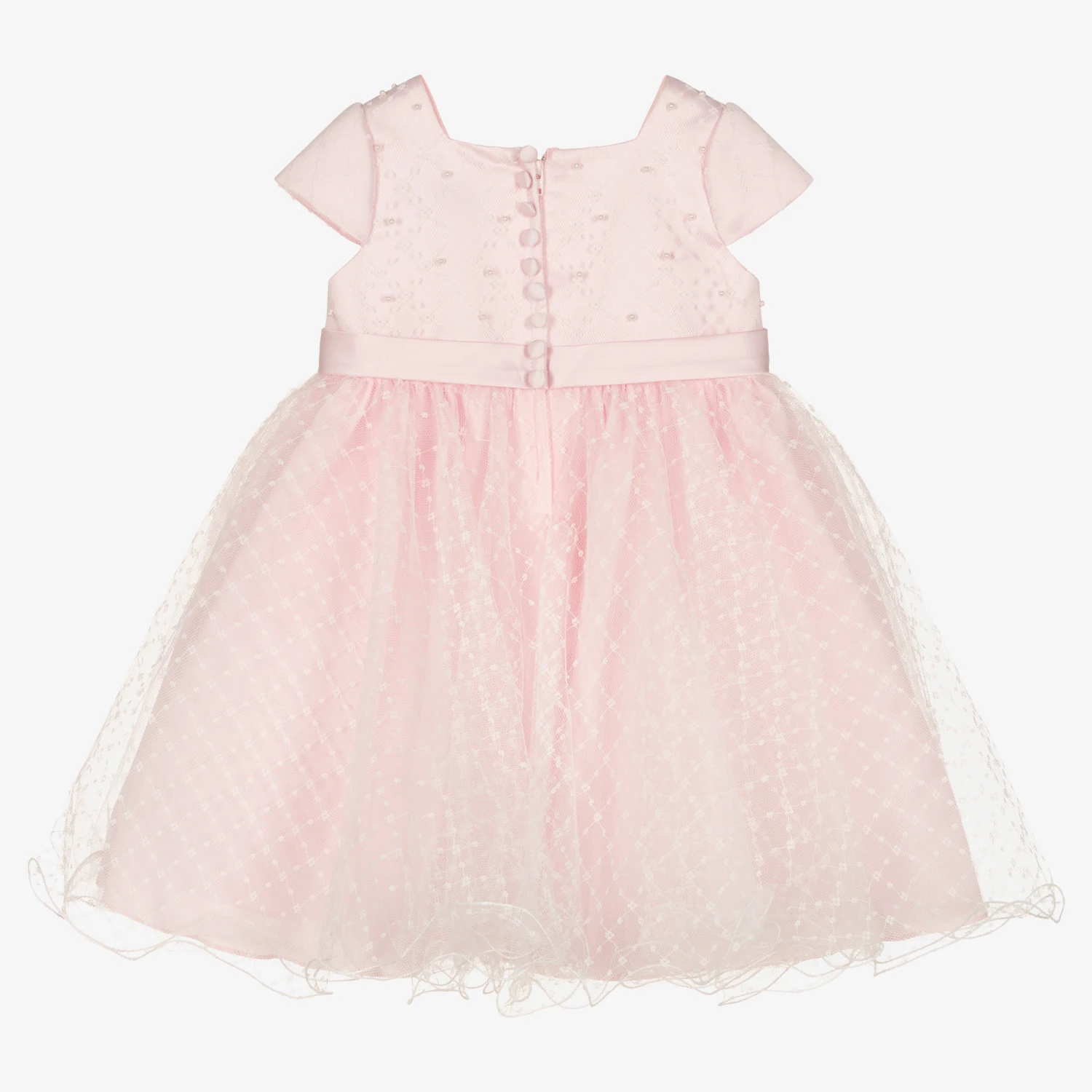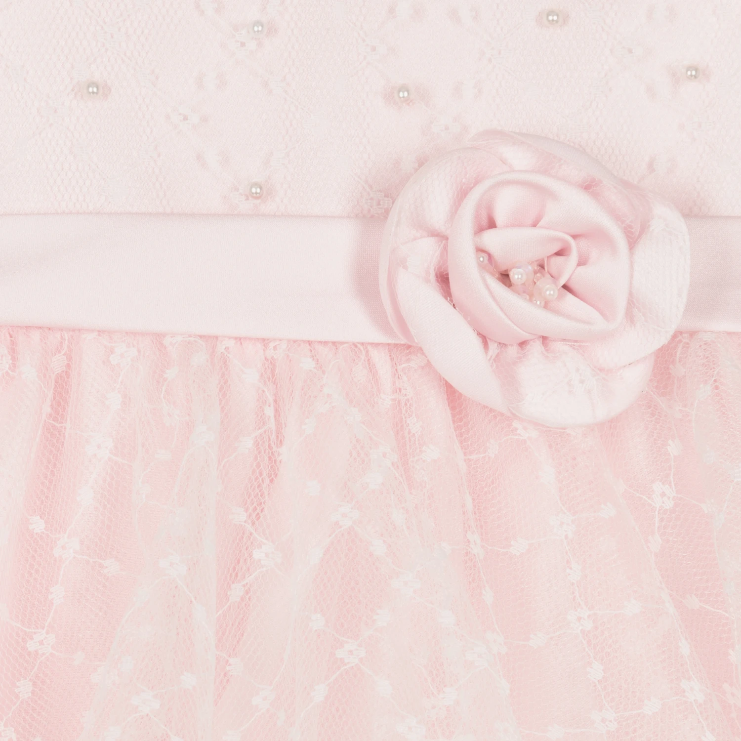 Girls elegant pale pink special occasion dress by Sarah Louise. This romantic design features a fitted satin bodice overlayed with delicate floral lace detailing and pearlised beads. It has capped sleeves, a soft square neckline, and floral appliqué for a beautiful and feminine finish. The soft and silky lining is trimmed with stiff tulle petticoat for added volume and shape. Finished with decorative buttons, the dress fastens with a concealed zip for a seamless finish.
