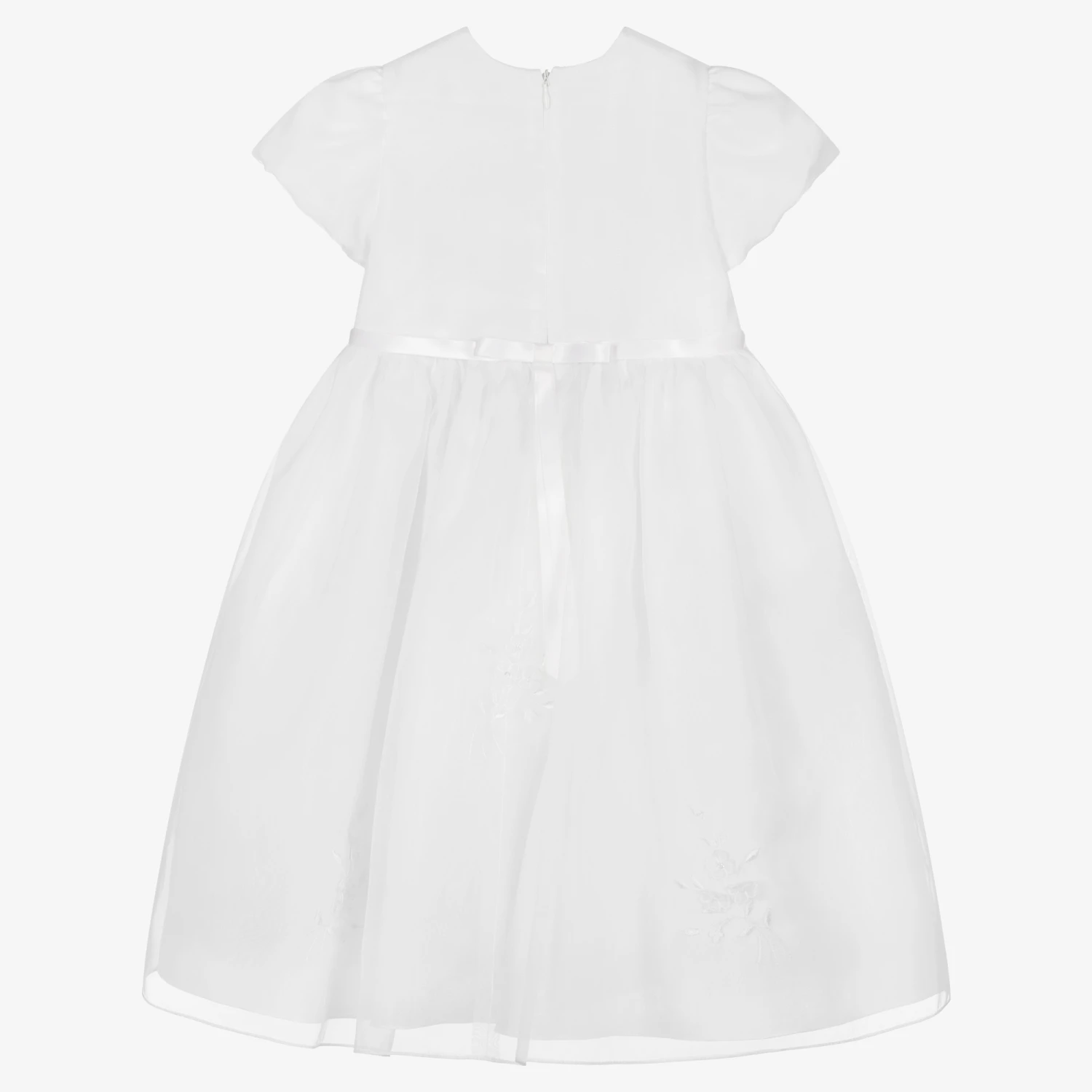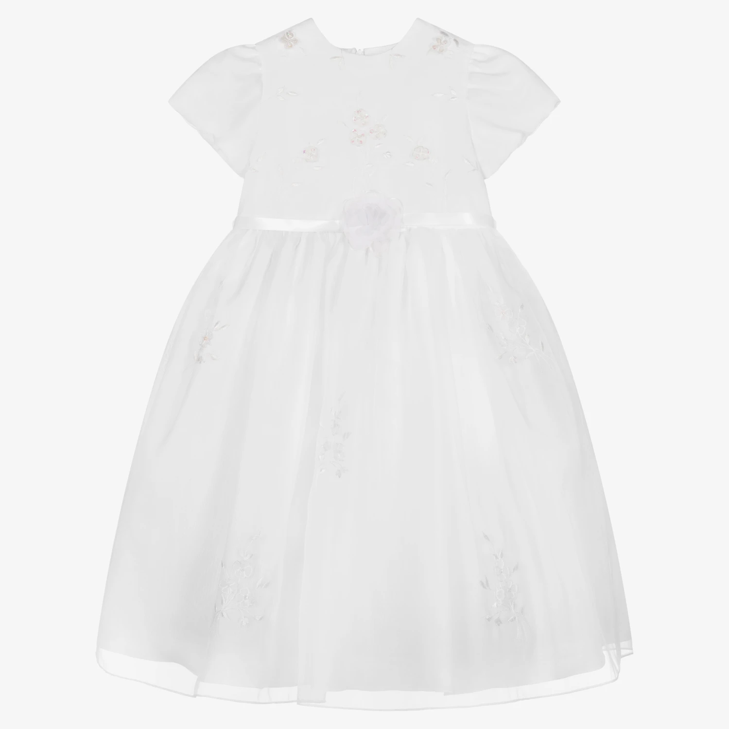 Beautiful white special occasion dress for girls by Sarah Louise, crafted from a silky smooth mid-weight organza. This elegant dress has intricate white floral embroidery details, small faux pearls, and sequins for a touch of sparkle. The fixed ribbon belt with floral appliqué and capped sleeves complete this romantic silhouette. The skirt is lined with silky satin with a stiff tulle trim for added volume. It fastens with a concealed zip on the back for easy dressing.