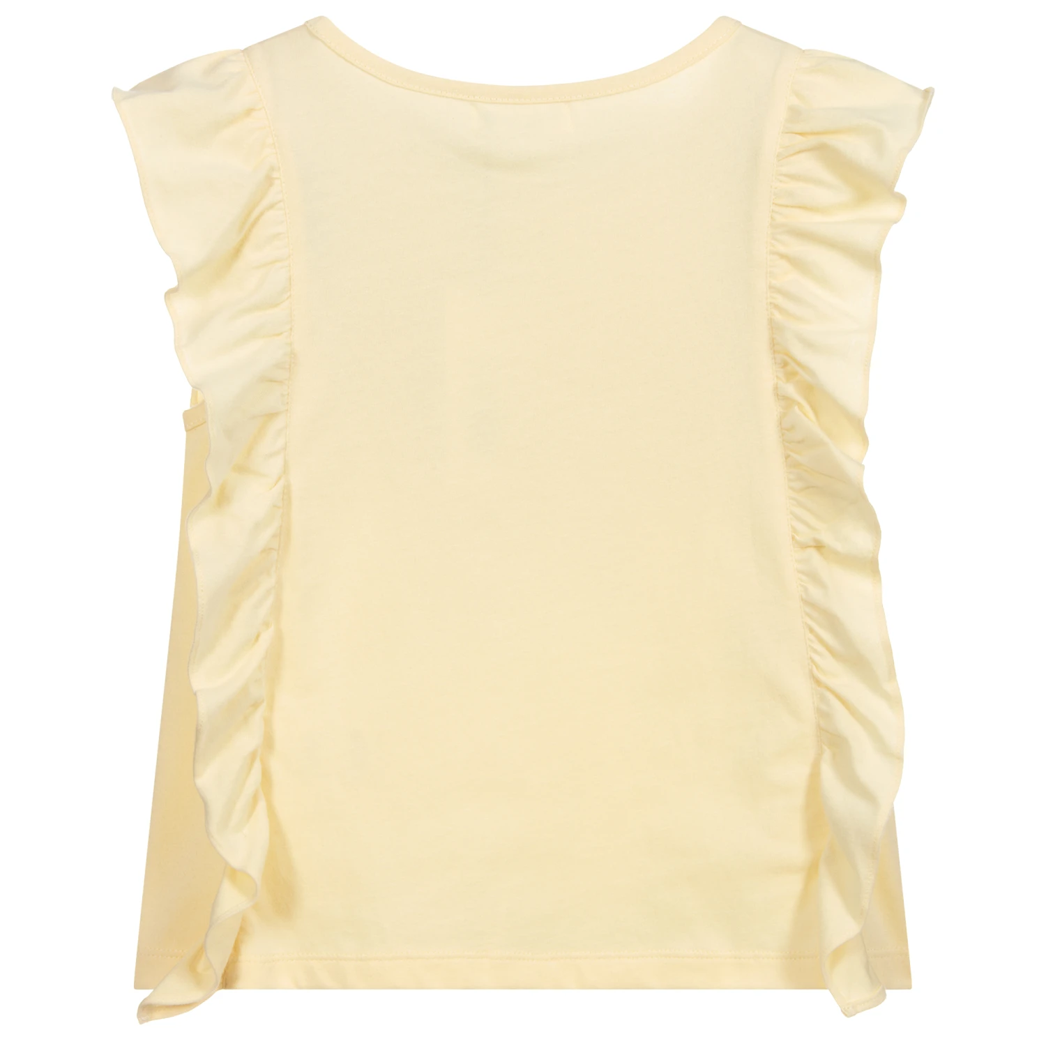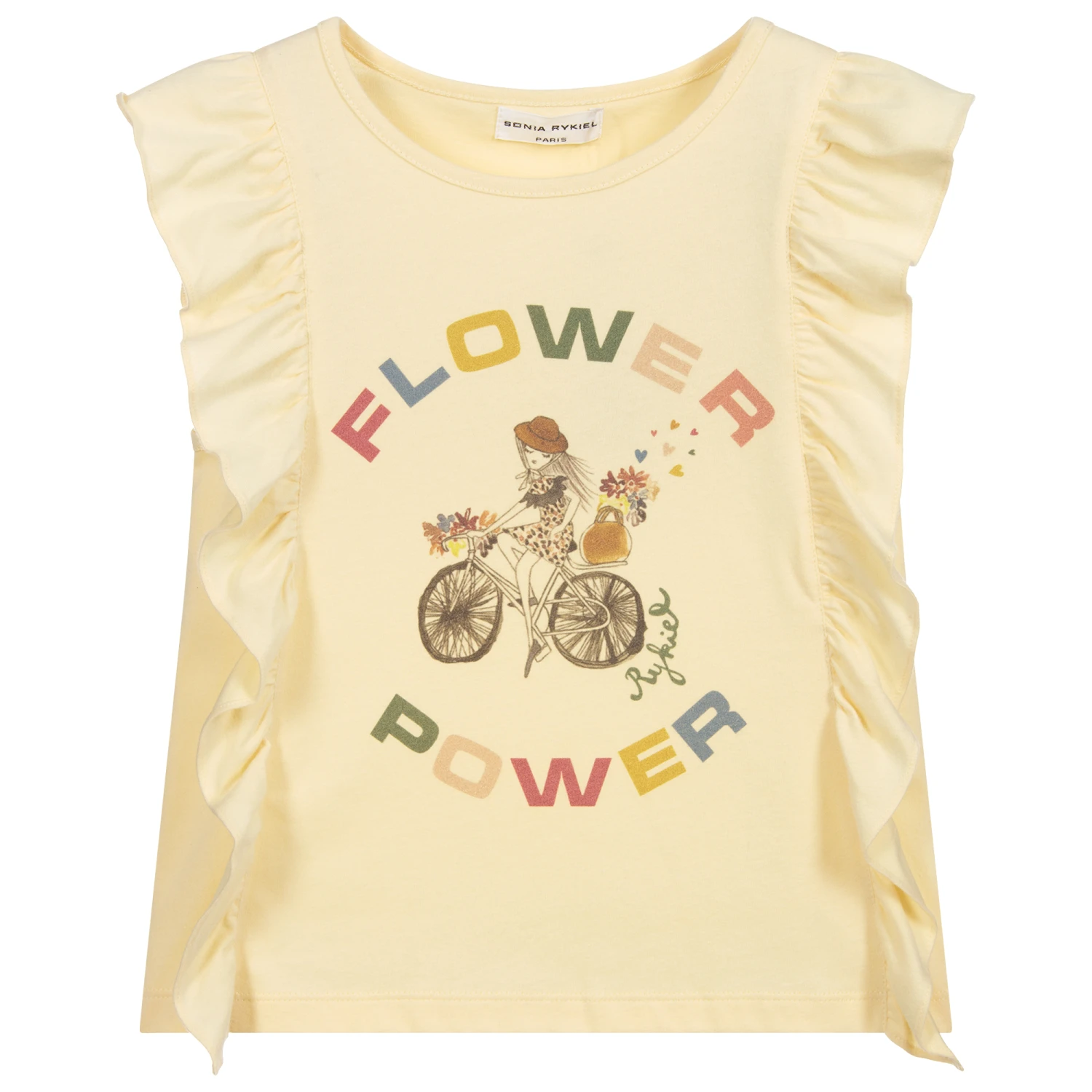 A pretty vintage style T-shirt by Sonia Rykiel Paris, in pale yellow, with a girl in springtime print. Made in super soft, brushed cotton jersey, it has ruffles over the shoulders.
