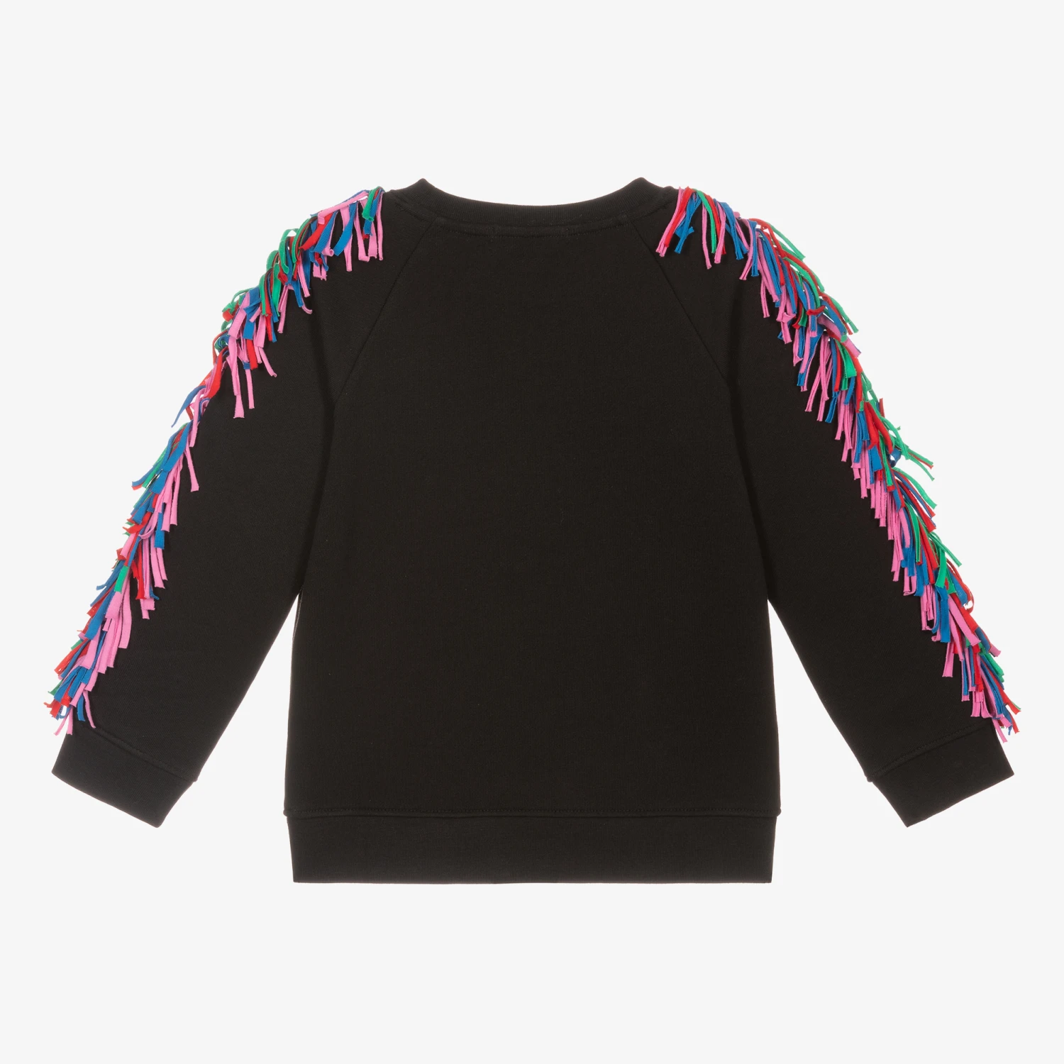 Black sweatshirt for girls from Stella McCartney Kids. This fun design has colourful fringing along the raglan sleeves and multicolour glitter shapes printed on the front. Casual and comfortable, it is made in organic cotton jersey with a soft fleecy underside.