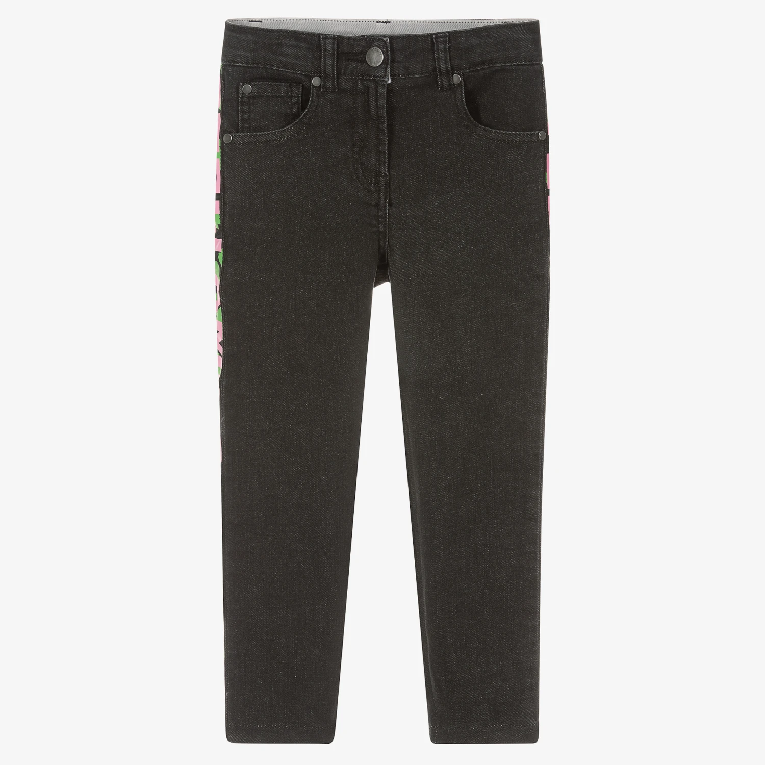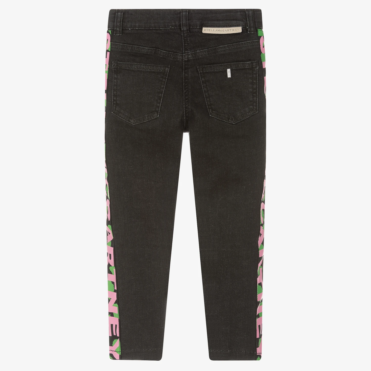 Washed black skinny jeans for girls by British designer, Stella McCartney Kids. Made in soft organic cotton denim with a slight stretch for comfort, this classic five pocket style has stand-out side trim, with bold pink logo prints on a black and green patterned background. The adjustable waist has a logo tab at the back and the jeans fasten with a zip and hook. The Stella McCartney fit can be quite small so choose a size up if you want room to grow.