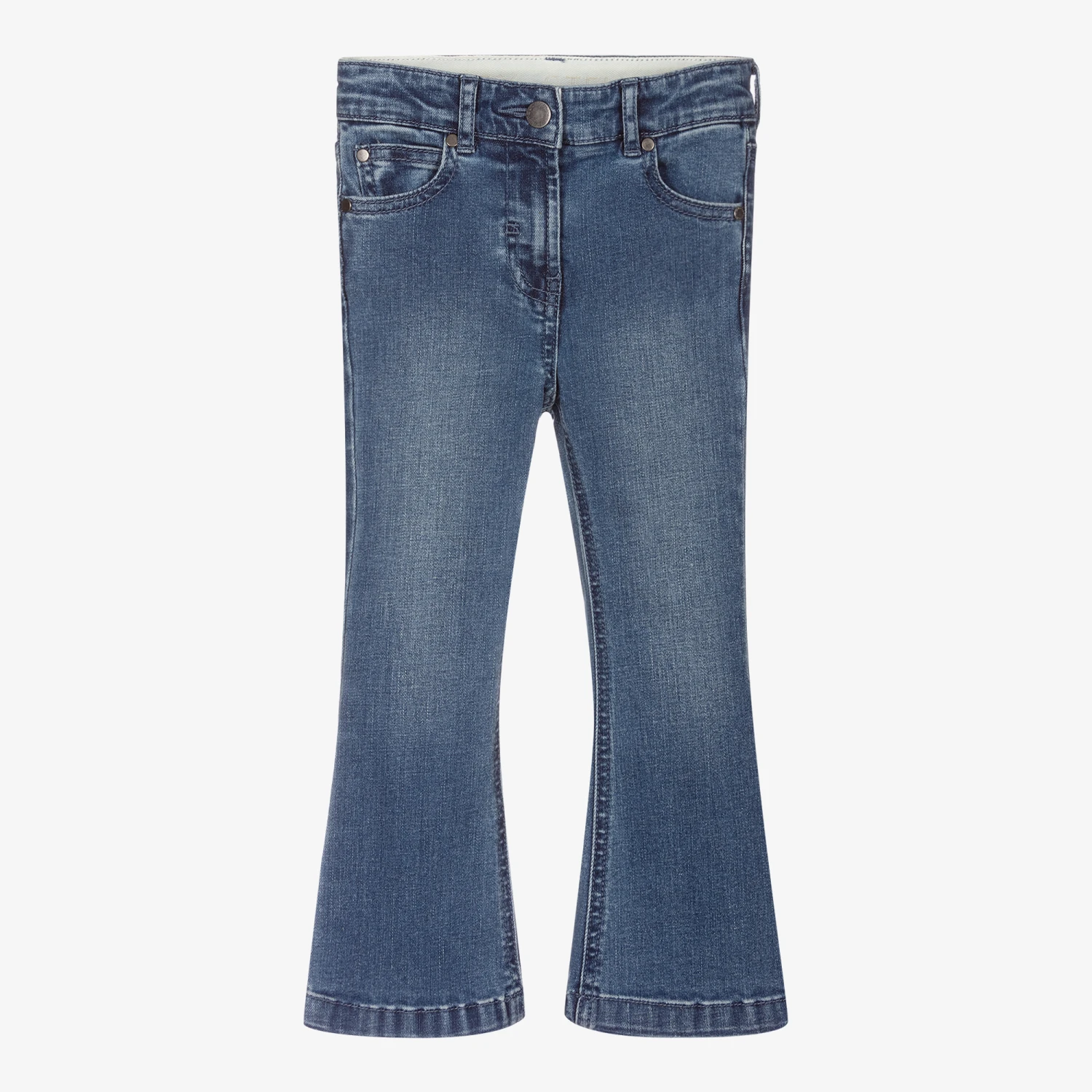 Blue denim flared jeans for girls, by Stella McCartney Kids. Made from soft organic cotton, they have a beige logo badge on the back with a white heart print on the pockets.