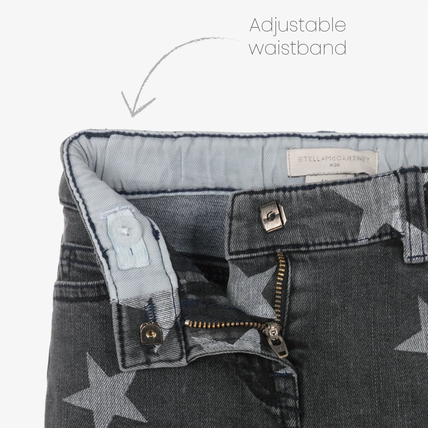 Grey and blue skinny jeans for girls by Stella McCartney Kids, made in organic cotton denim with a comfortable stretch. Patterned with a fun star print on the front and back, they have frayed cuffs, classic five pocket styling, and a useful adjustable waist for a great fit.