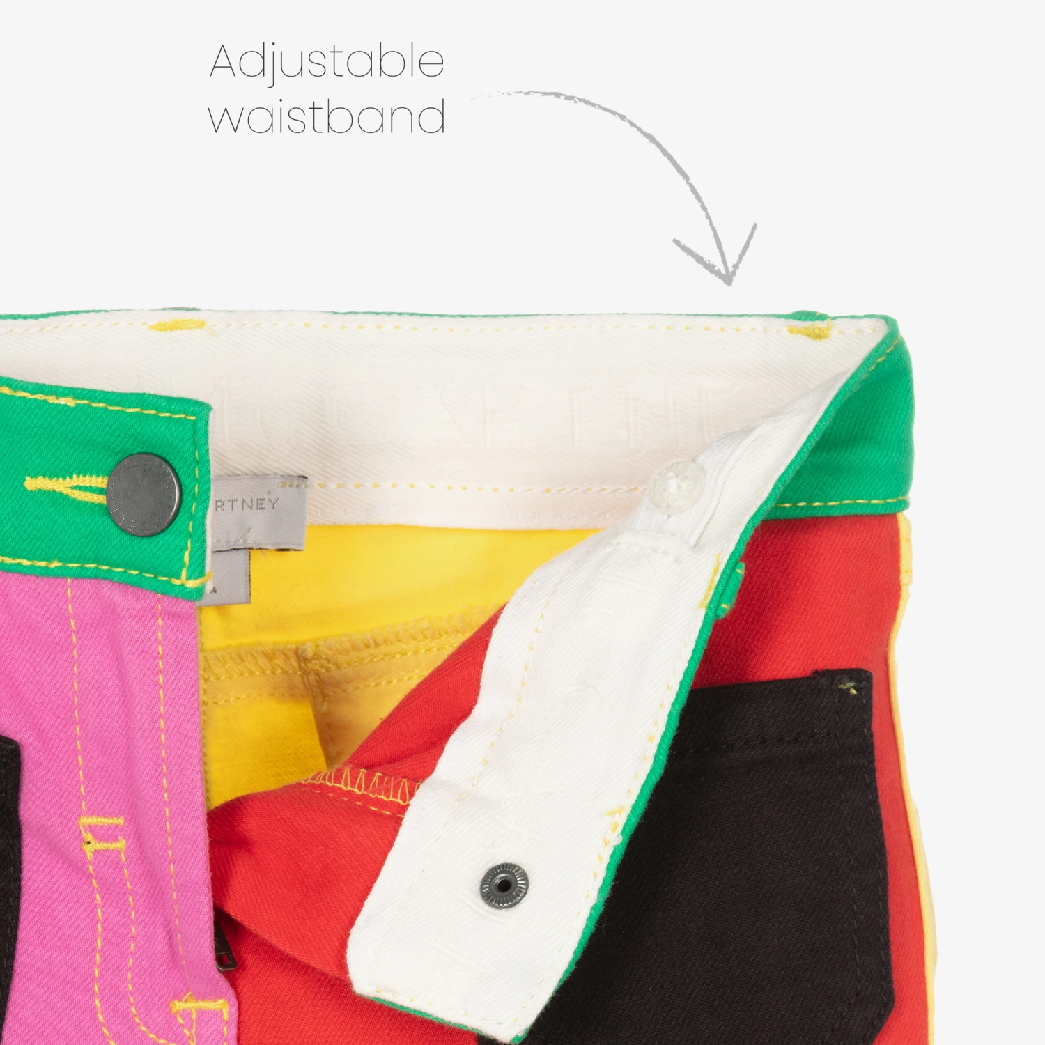 Fun, stand out, colourblock jeans for girls by British brand Stella McCartney Kids. Made in organic cotton denim, they have useful patch pockets on the front in black and an adjustable waistband for a comfortable fit. They fasten with a logo hook and eye with a zip below. There is a logo tab with two more pockets around the back.