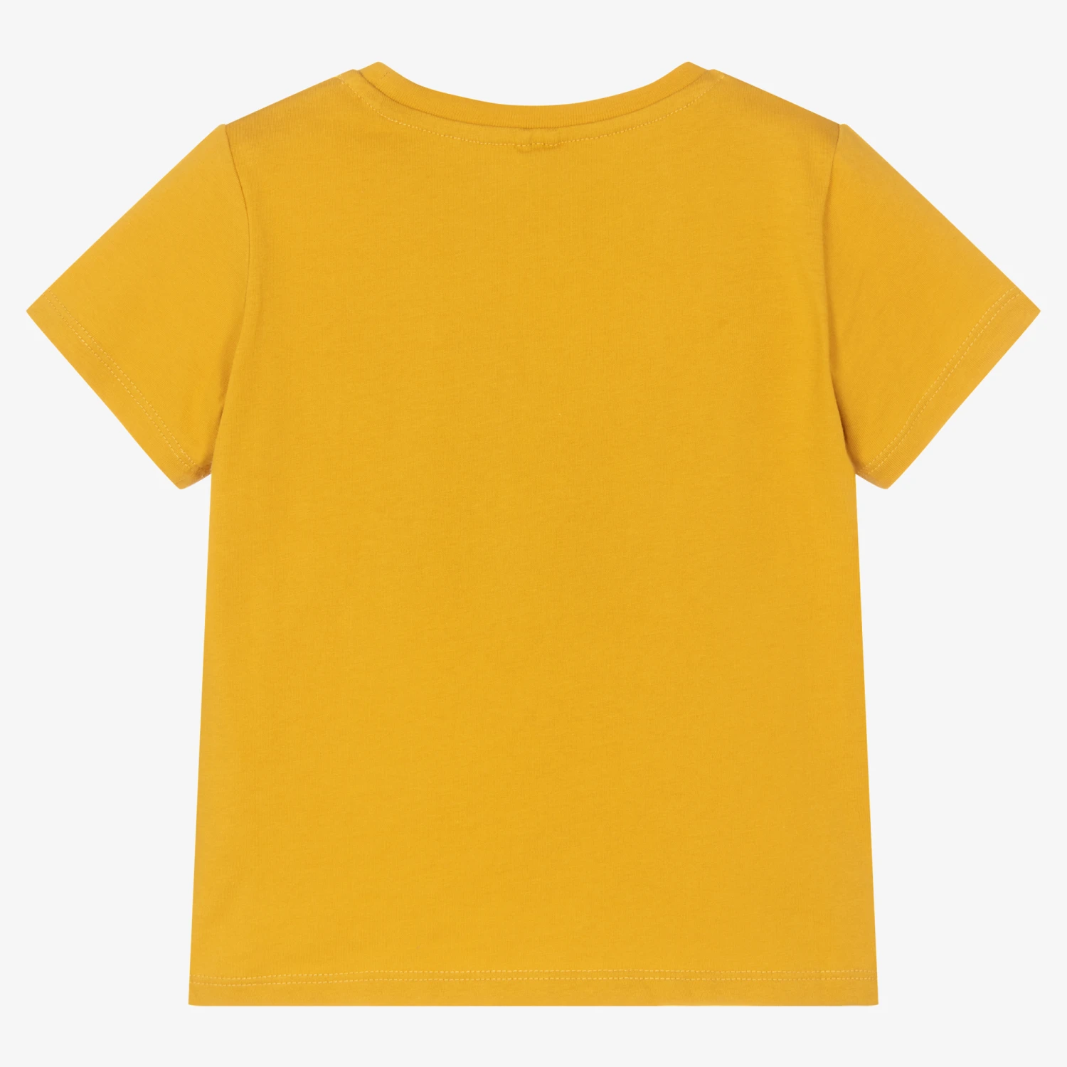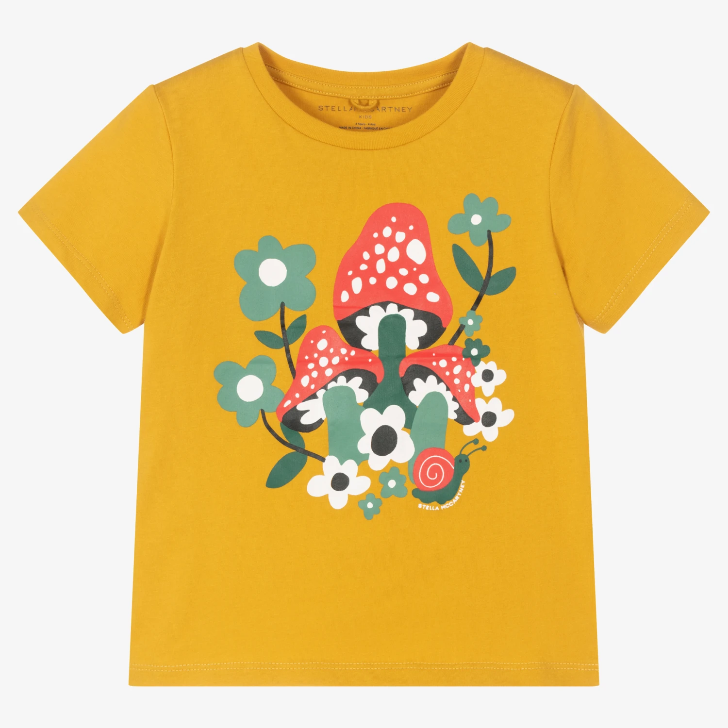 Sweet mustard yellow t-shirt for girls by cool British brand Stella McCartney Kids. Made in comfortable, organic cotton jersey, it has red, green and white mushrooms printed on the front, with a snail and the designer’s logo.