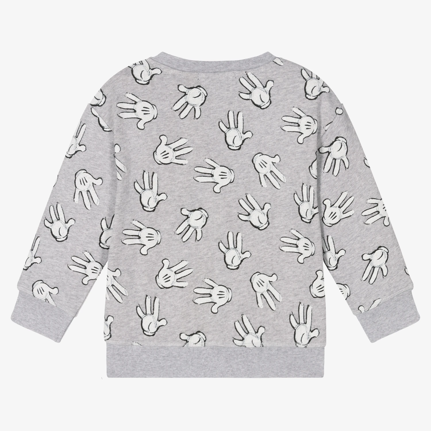 Grey marl sweatshirt for boys and girls from British designer Stella McCartney Kids. Forming part of the Disney© Fantasia capsule collection, this organic cotton sweatshirt has iconic black and white Mickey hand prints in an all-over design. Soft, stretchy and comfortable, it has dropped shoulders and ribbed trims for a casual look.