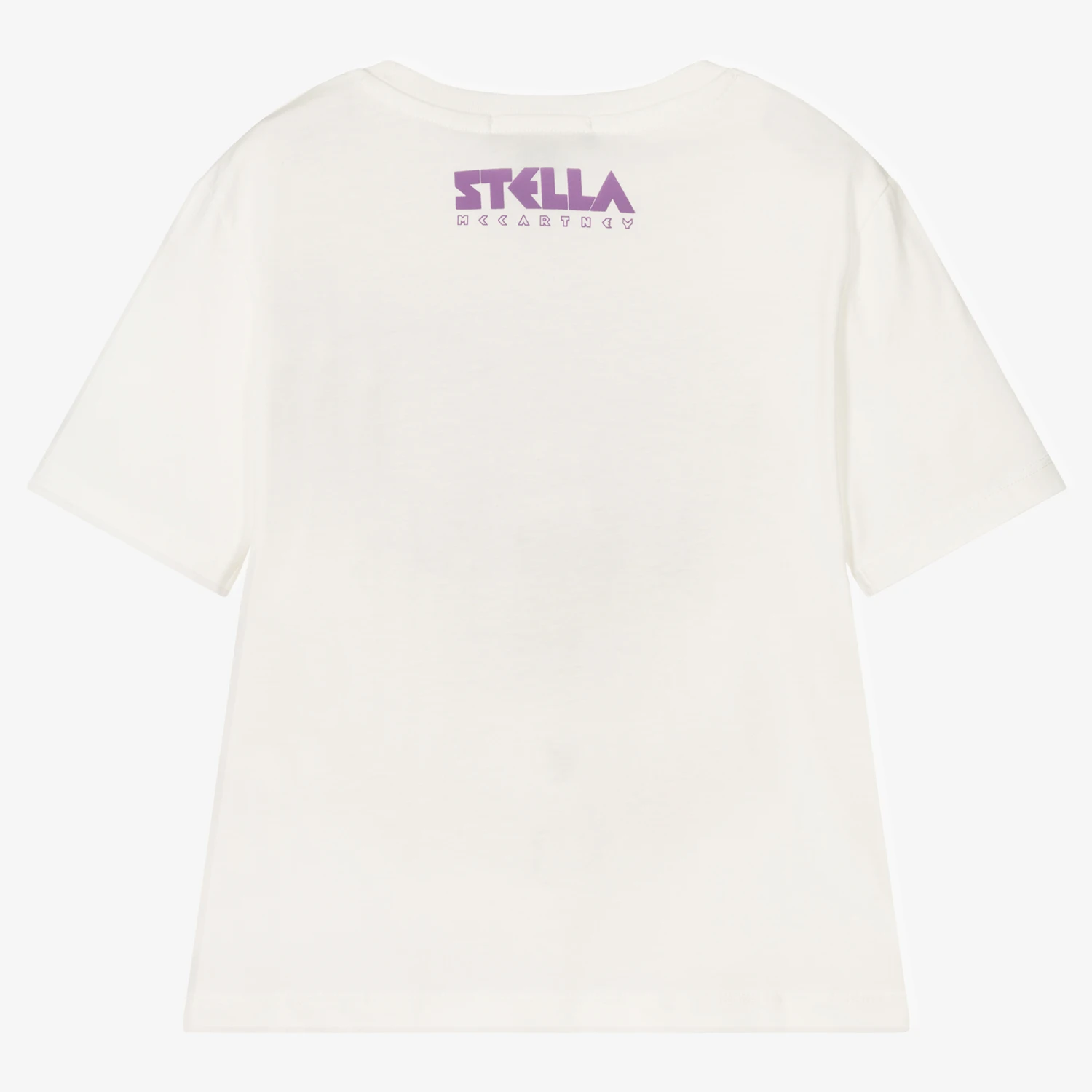 A fun ivory organic cotton T-shirt for girls from British designer Stella McCartney Kids. Forming part of Disney© Fantasia capsule collection, it has a psychedelic Pegasus graphic in vibrant lilac purple and orange. This top is made in soft and stretchy jersey, comfortable for all-day wear.