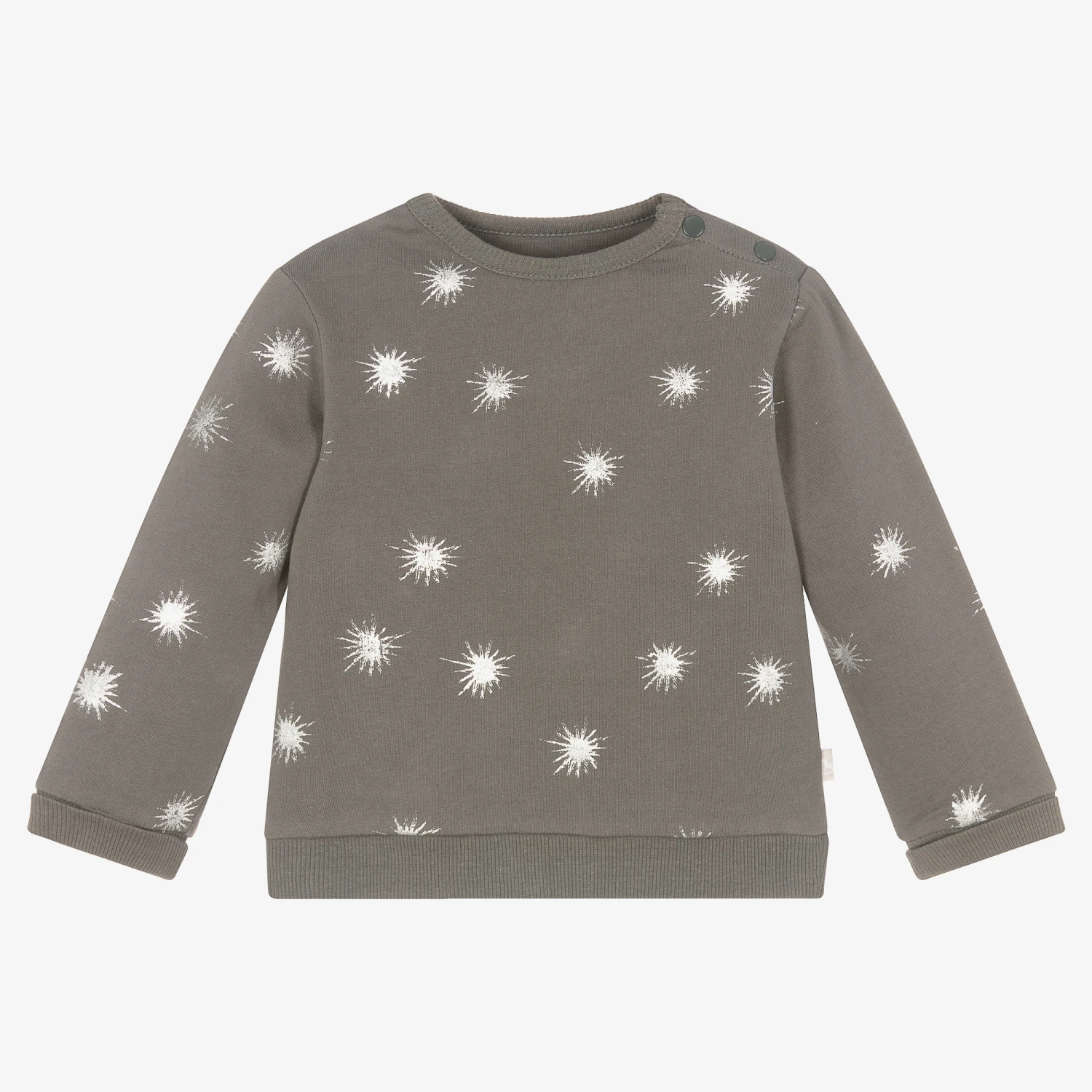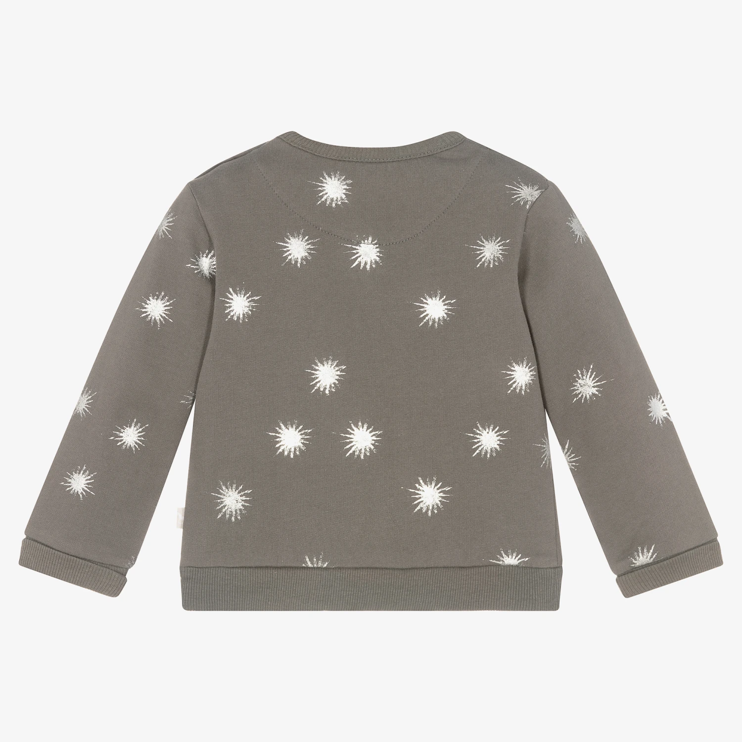 Lightweight cotton sweatshirt for younger girls from The Little Tailor, with a silver starburst print. Made in soft and comfortable cotton jersey with a brushed feel inside, it has ribbed trims and shoulder popper fastenings on smaller sizes for easy dressing.